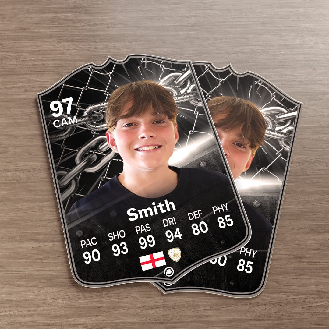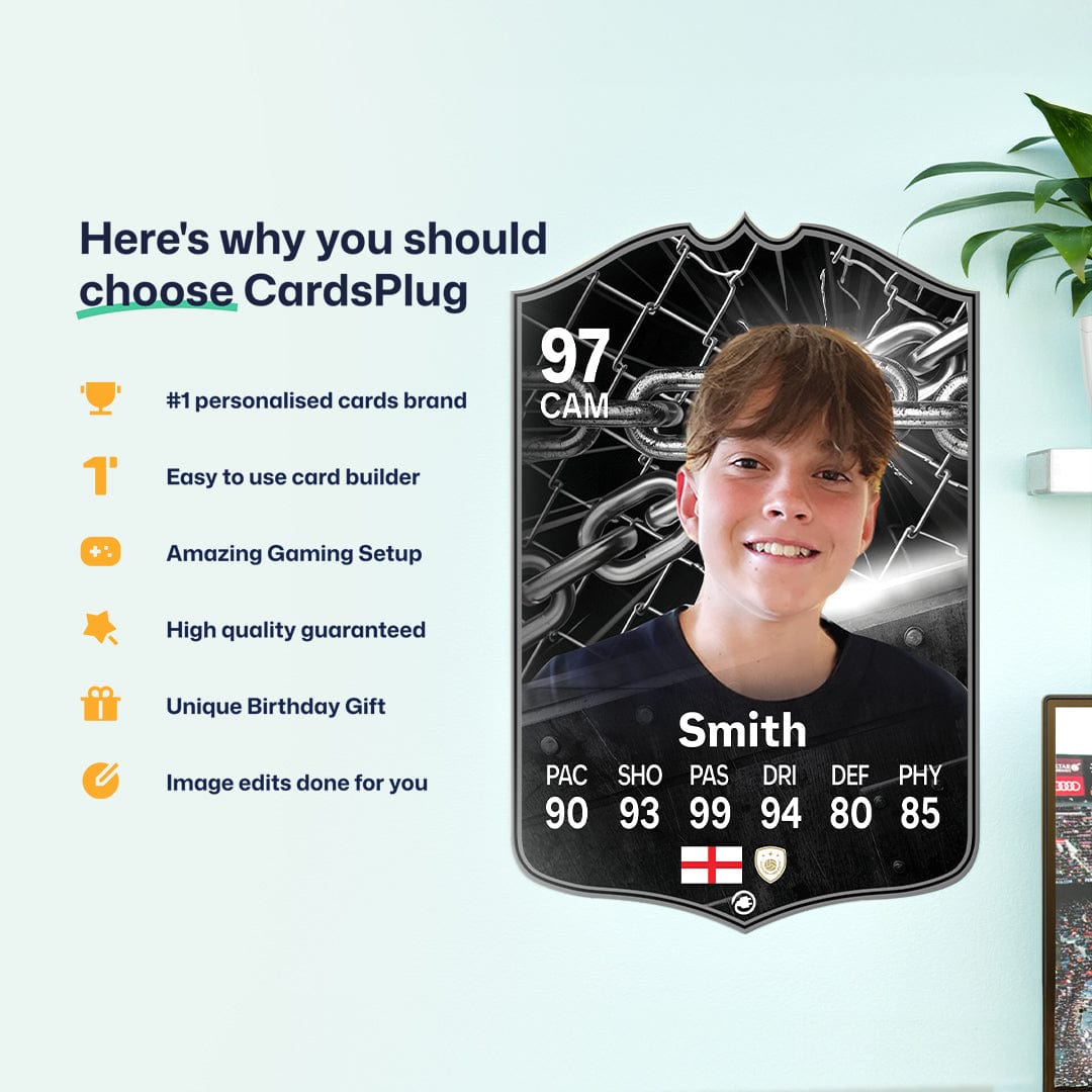 CardsPlug is home to the world’s favourite personalised football cards. Our easy football card builder lets you make a real life football card with your own name, photo, and skill ratings. With 100+ designs to choose from and some inspired by EA SPORTS FC 26 cards seen in EA FC 26, EA FC 25 and FC 24 as well as FIFA cards seen in games like FIFA 23 and FIFA 22.