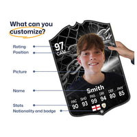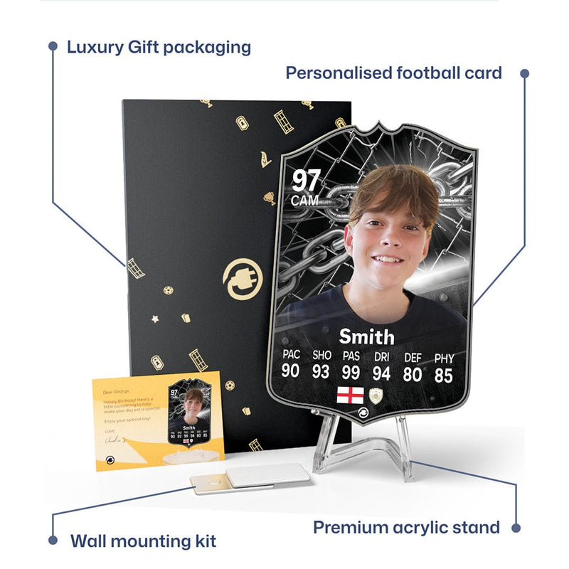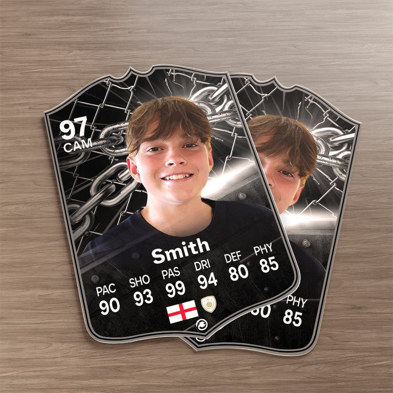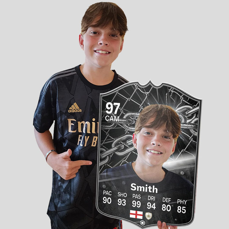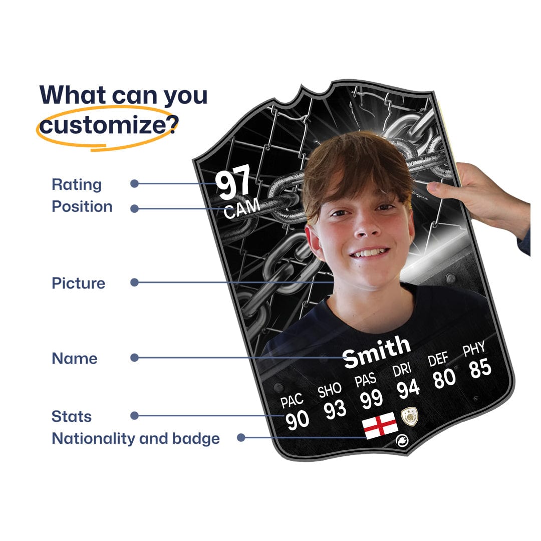 When it comes to personalising your card, the basic steps are to upload a photo and add a name to your card. Then you’ll add details like your player’s position and skill ratings out of 99 for each football skill shown on the card. Our online card builder makes this really easy. And if you aren’t a football card expert, don’t worry!