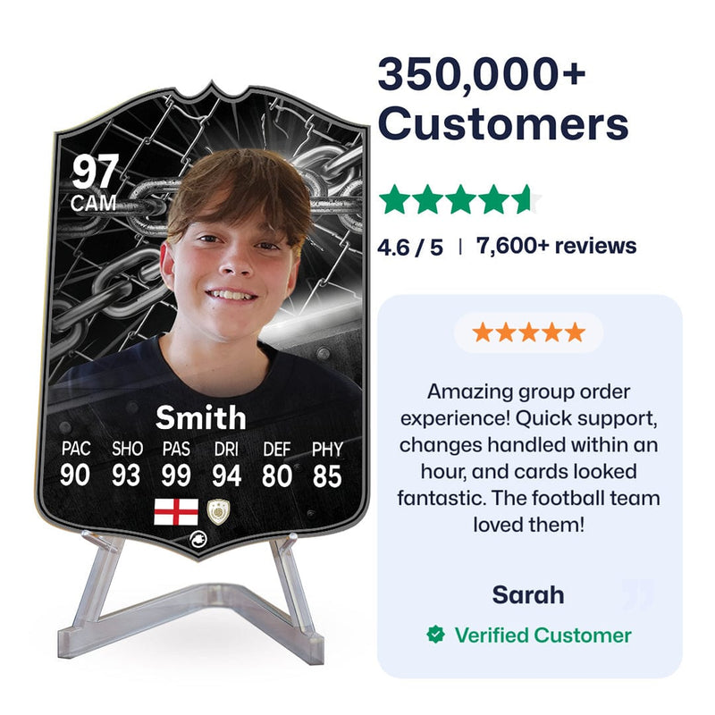 Yes! Our football card designers will remove the background from the photo you upload so it looks just like the football cards you might’ve seen games like EA FC 25, EA FC 24 or FIFA. We’ll also position the photo perfectly on the football card so it looks great. If there are any problems with the quality of your photo, we’ll reach out and let you know. Plus, our website's AI will remove the background on the image for visual purposes before purchase so you can see it without a background on the card.