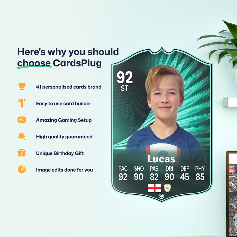 CardsPlug is home to the world’s favourite personalised football cards. Our easy football card builder lets you make a real life football card with your own name, photo, and skill ratings. With 100+ designs to choose from and some inspired by EA SPORTS FC 26 cards seen in EA FC 26, EA FC 25 and FC 24 as well as FIFA cards seen in games like FIFA 23 and FIFA 22.