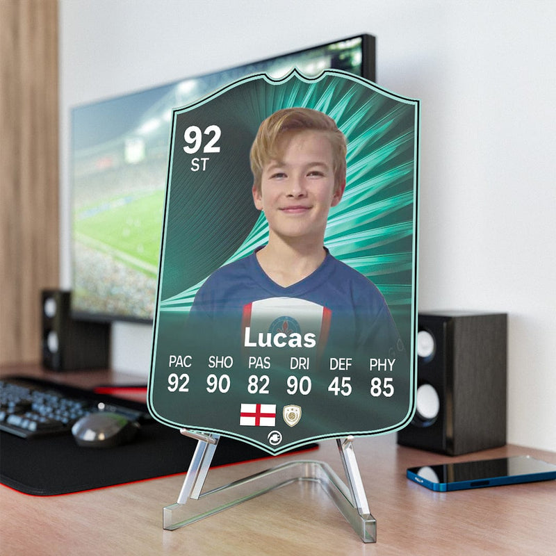 When it comes to personalising your card, the basic steps are to upload a photo and add a name to your card. Then you’ll add details like your player’s position and skill ratings out of 99 for each football skill shown on the card. Our online card builder makes this really easy. And if you aren’t a football card expert, don’t worry!