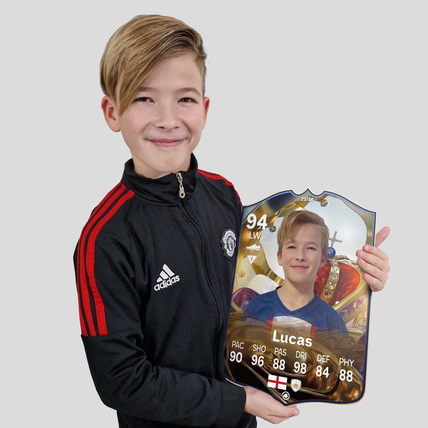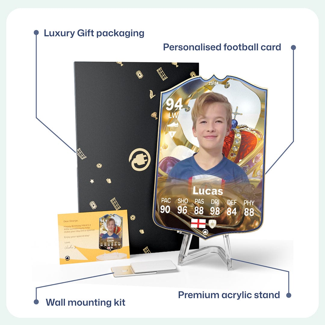 When it comes to personalising your card, the basic steps are to upload a photo and add a name to your card. Then you’ll add details like your player’s position and skill ratings out of 99 for each football skill shown on the card. Our online card builder makes this really easy. And if you aren’t a football card expert, don’t worry!