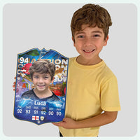 Our football card builder lets you choose between two different card materials. Our Standard cards are made of a ultra-strong variety of Foamex (not cardboard or foam!). This material has a lovely gloss finish and is also super durable. Our world-exclusive Metal football cards have a matte finish and are slightly heavier. Both look amazing and will last forever.