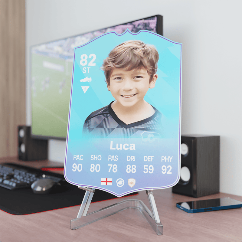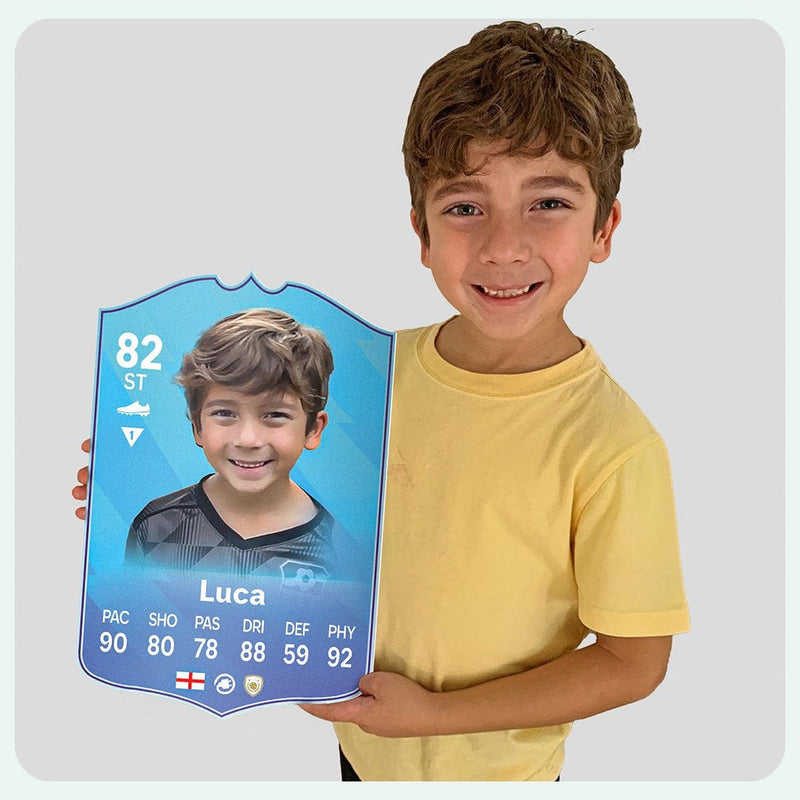 When it comes to personalising your card, the basic steps are to upload a photo and add a name to your card. Then you’ll add details like your player’s position and skill ratings out of 99 for each football skill shown on the card. Our online card builder makes this really easy. And if you aren’t a football card expert, don’t worry!
