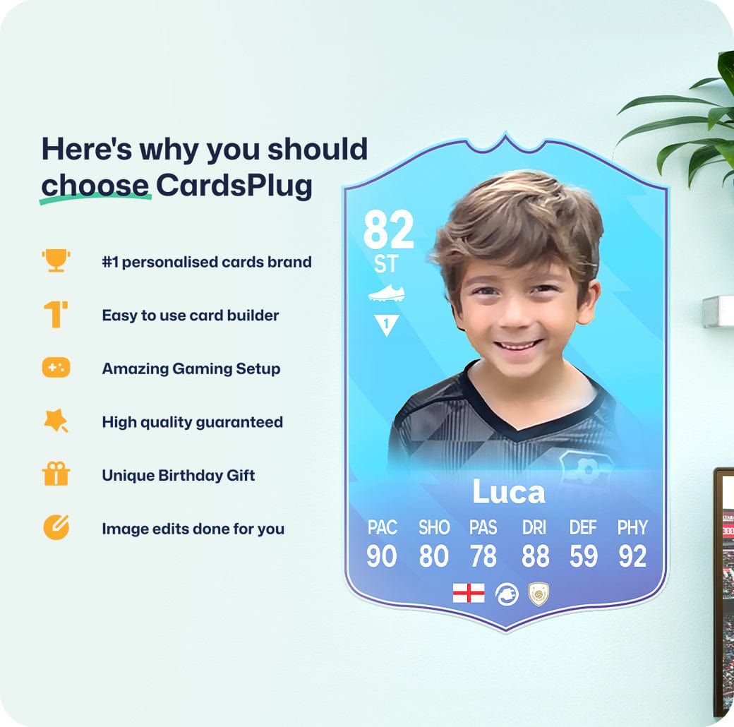 CardsPlug is home to the world’s favourite personalised football cards. Our easy football card builder lets you make a real life football card with your own name, photo, and skill ratings. With 100+ designs to choose from and some inspired by EA SPORTS FC 26 cards seen in EA FC 26, EA FC 25 and FC 24 as well as FIFA cards seen in games like FIFA 23 and FIFA 22.