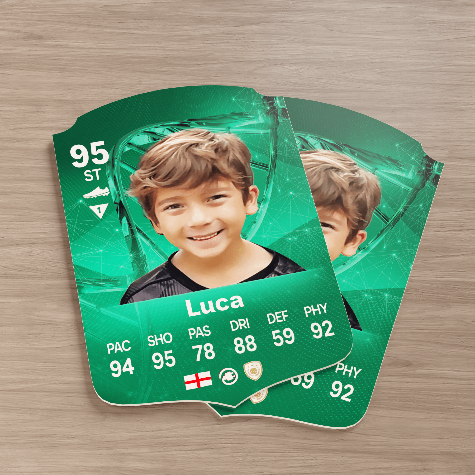 When it comes to personalising your card, the basic steps are to upload a photo and add a name to your card. Then you’ll add details like your player’s position and skill ratings out of 99 for each football skill shown on the card. Our online card builder makes this really easy. And if you aren’t a football card expert, don’t worry!