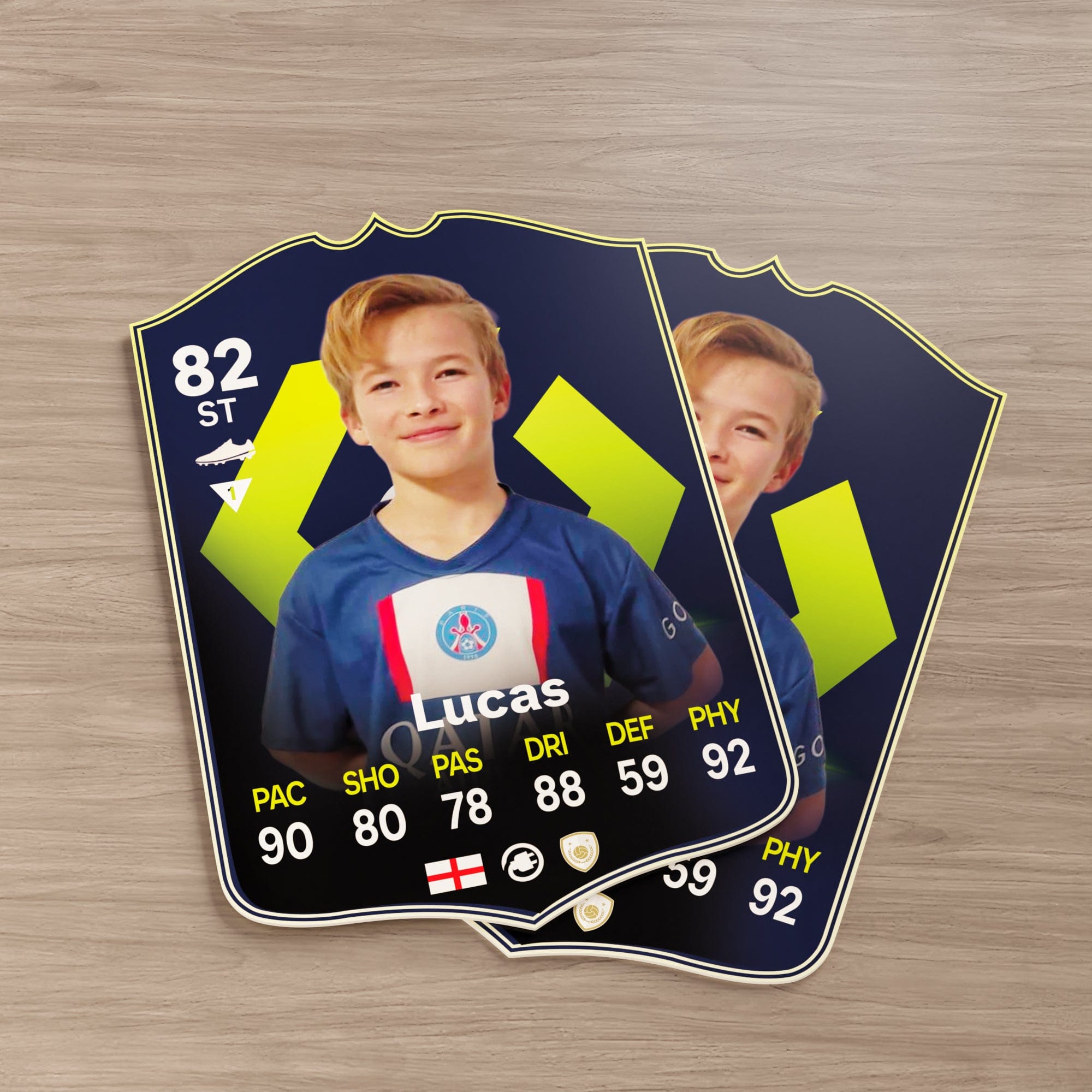 Our football card builder lets you choose between two different card materials. Our Standard cards are made of a ultra-strong variety of Foamex (not cardboard or foam!). This material has a lovely gloss finish and is also super durable. Our world-exclusive Metal football cards have a matte finish and are slightly heavier. Both look amazing and will last forever.