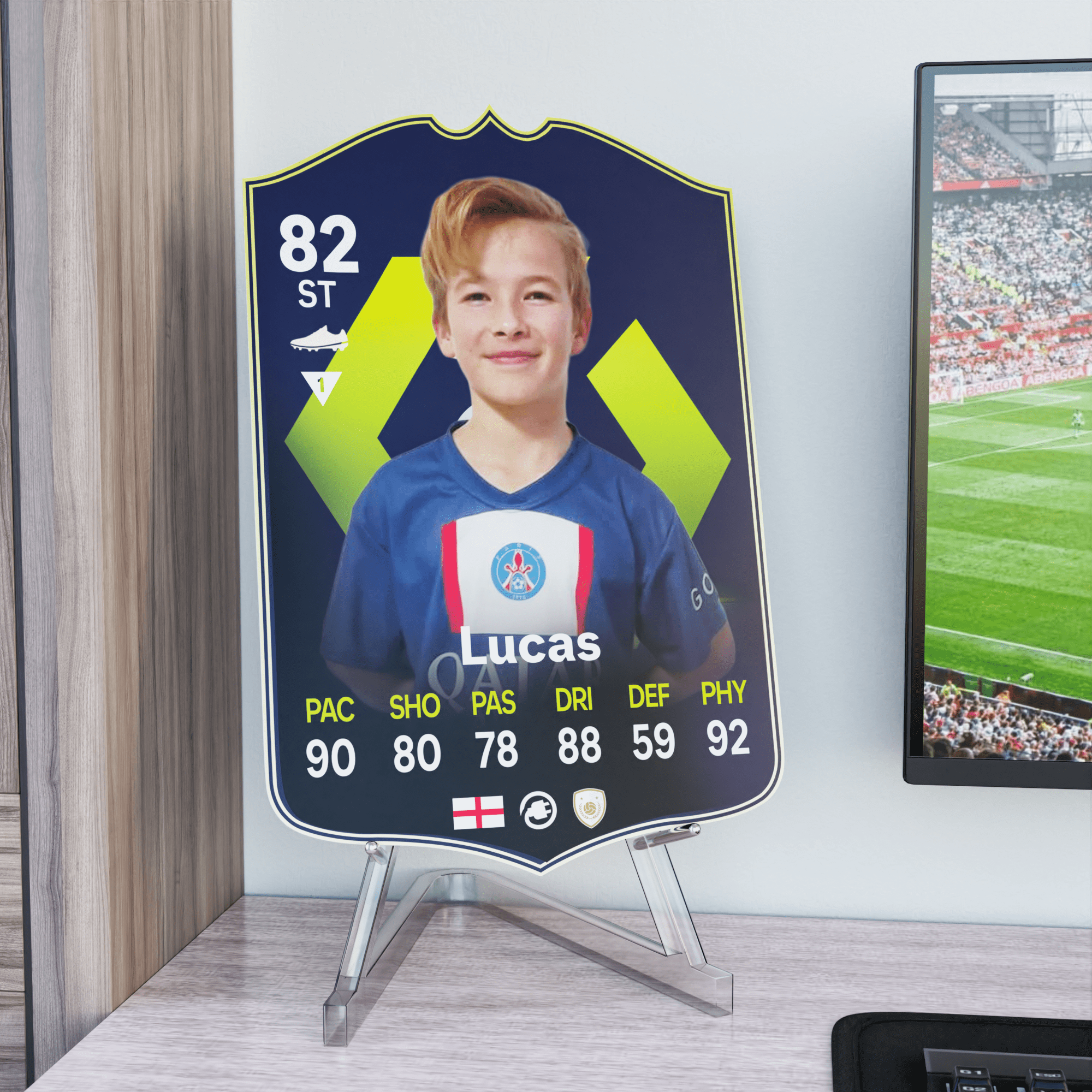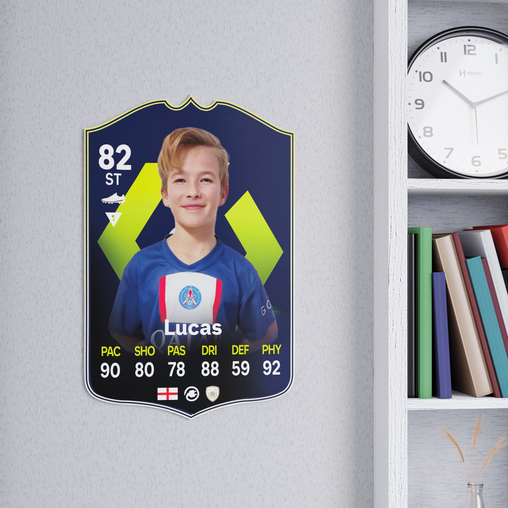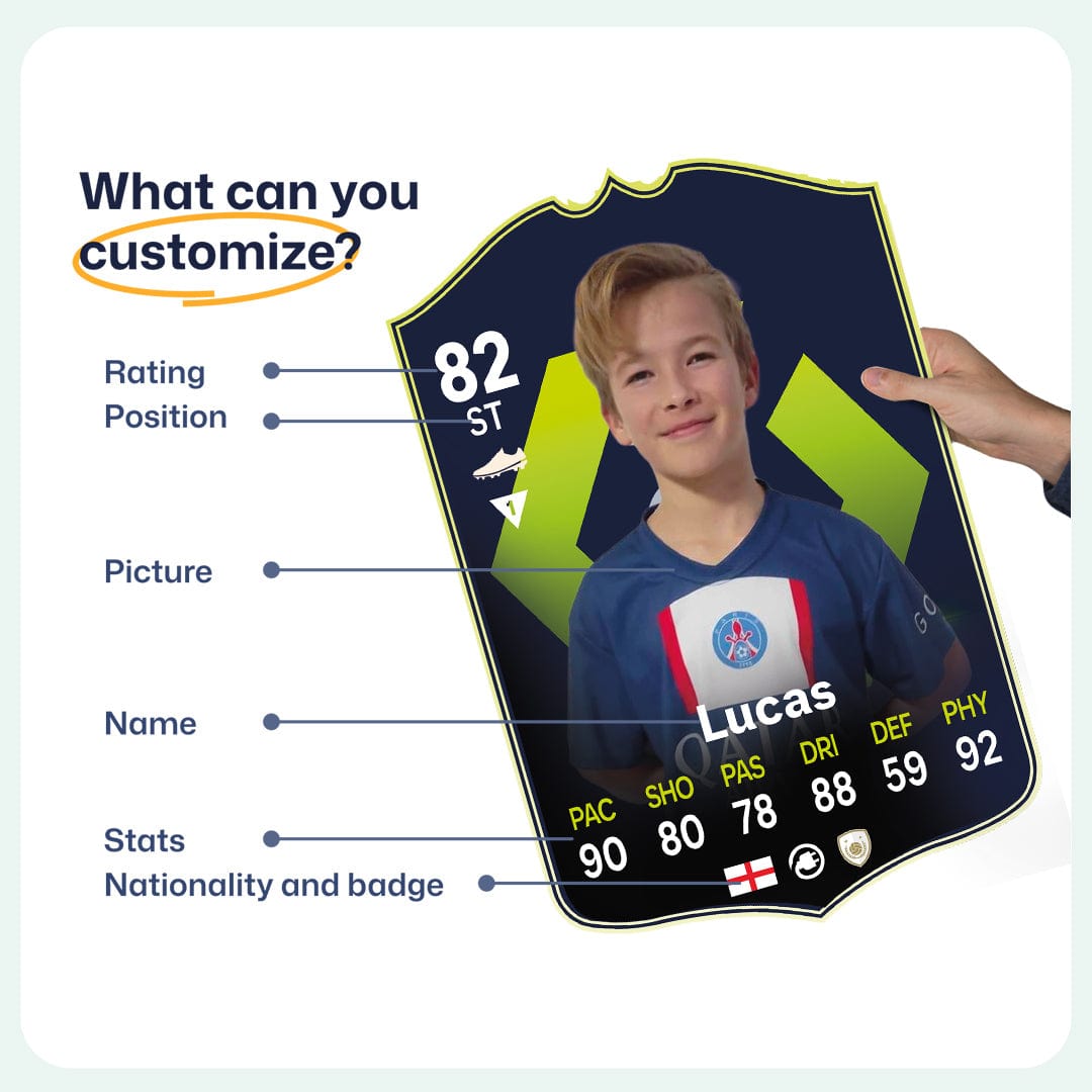 When it comes to personalising your card, the basic steps are to upload a photo and add a name to your card. Then you’ll add details like your player’s position and skill ratings out of 99 for each football skill shown on the card. Our online card builder makes this really easy. And if you aren’t a football card expert, don’t worry!
