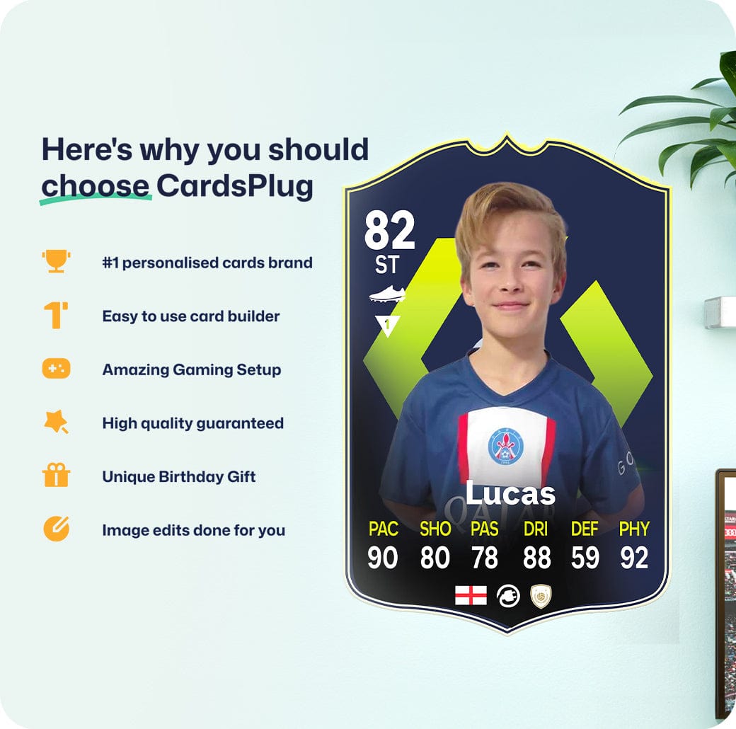 CardsPlug is home to the world’s favourite personalised football cards. Our easy football card builder lets you make a real life football card with your own name, photo, and skill ratings. With 100+ designs to choose from and some inspired by EA SPORTS FC 26 cards seen in EA FC 26, EA FC 25 and FC 24 as well as FIFA cards seen in games like FIFA 23 and FIFA 22.