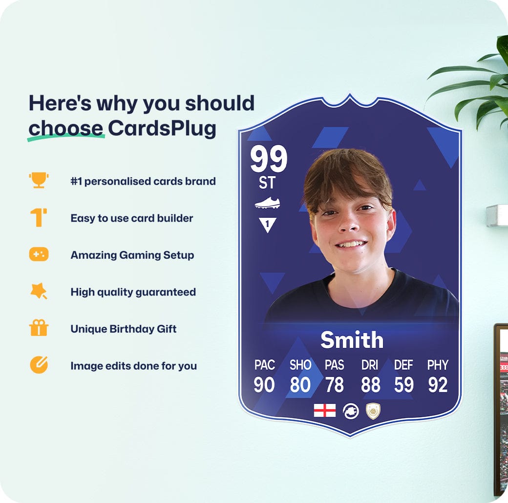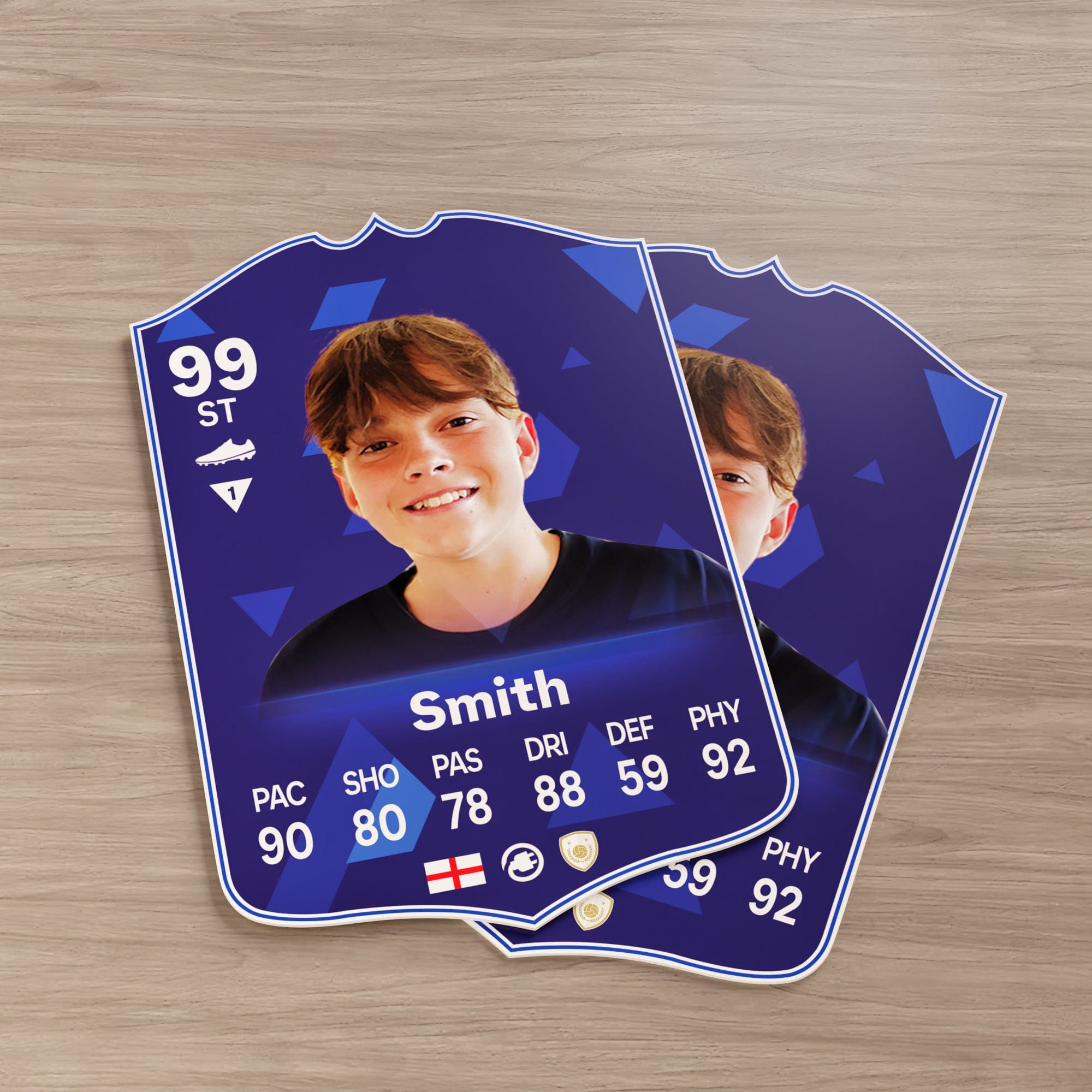 CardsPlug is home to the world’s favourite personalised football cards. Our easy football card builder lets you make a real life football card with your own name, photo, and skill ratings. With 100+ designs to choose from and some inspired by EA SPORTS FC 26 cards seen in EA FC 26, EA FC 25 and FC 24 as well as FIFA cards seen in games like FIFA 23 and FIFA 22.