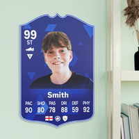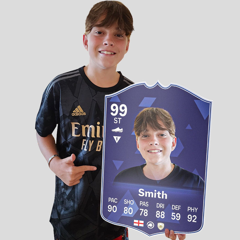 When it comes to personalising your card, the basic steps are to upload a photo and add a name to your card. Then you’ll add details like your player’s position and skill ratings out of 99 for each football skill shown on the card. Our online card builder makes this really easy. And if you aren’t a football card expert, don’t worry!