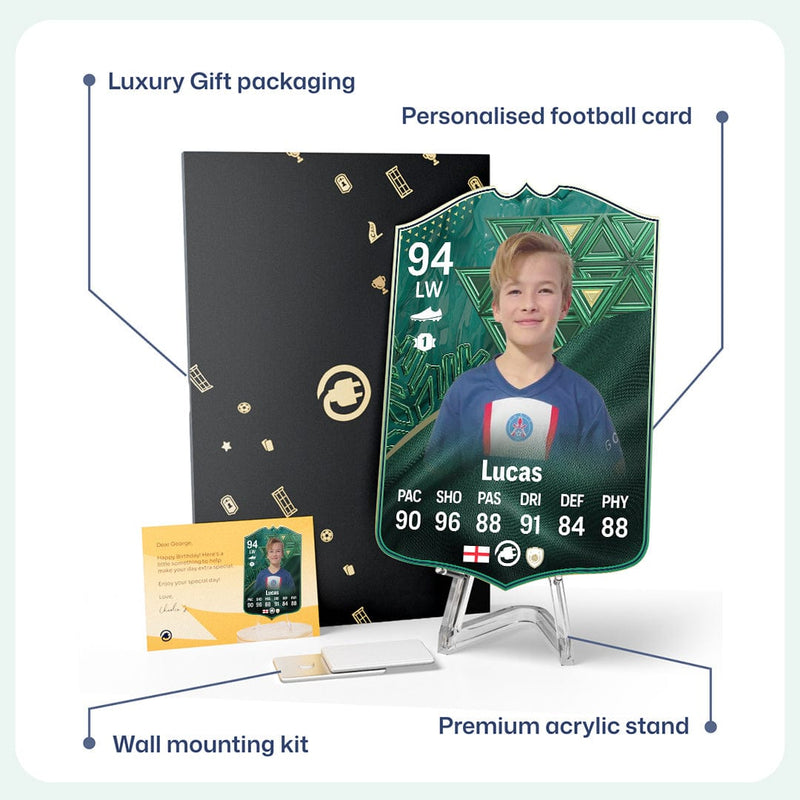 When it comes to personalising your card, the basic steps are to upload a photo and add a name to your card. Then you’ll add details like your player’s position and skill ratings out of 99 for each football skill shown on the card. Our online card builder makes this really easy. And if you aren’t a football card expert, don’t worry!