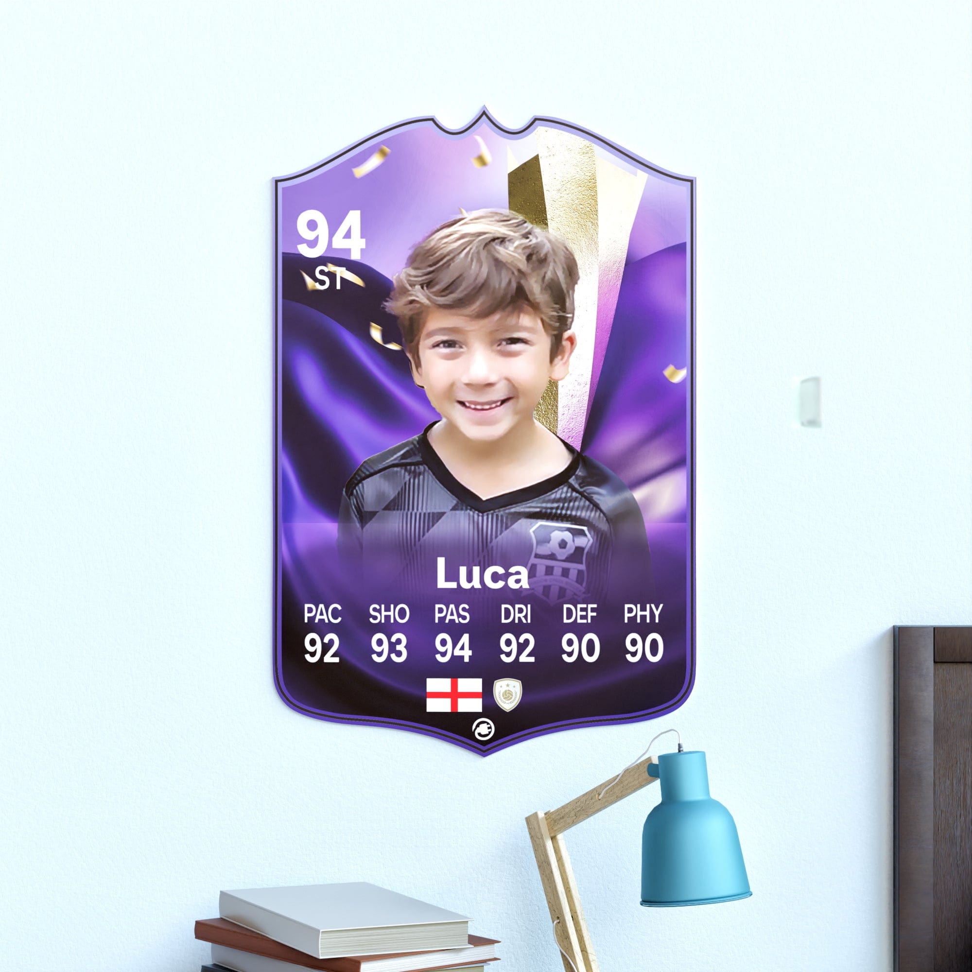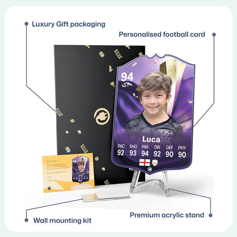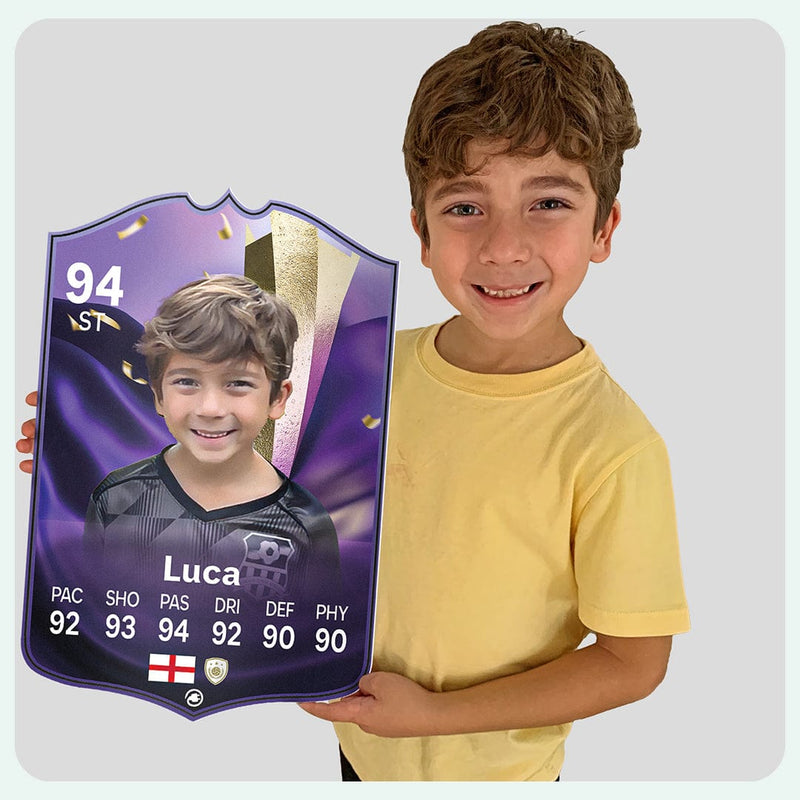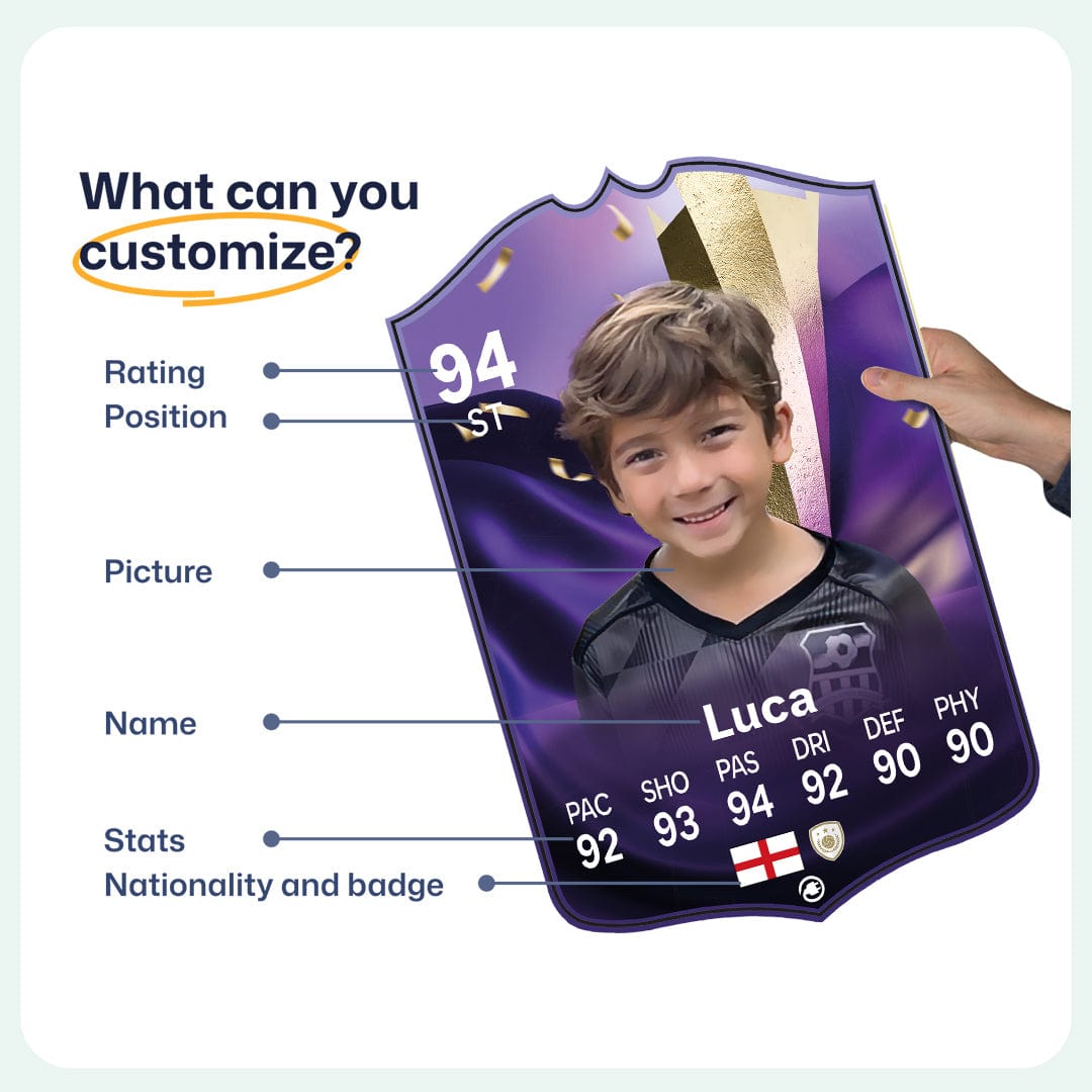 When it comes to personalising your card, the basic steps are to upload a photo and add a name to your card. Then you’ll add details like your player’s position and skill ratings out of 99 for each football skill shown on the card. Our online card builder makes this really easy. And if you aren’t a football card expert, don’t worry!