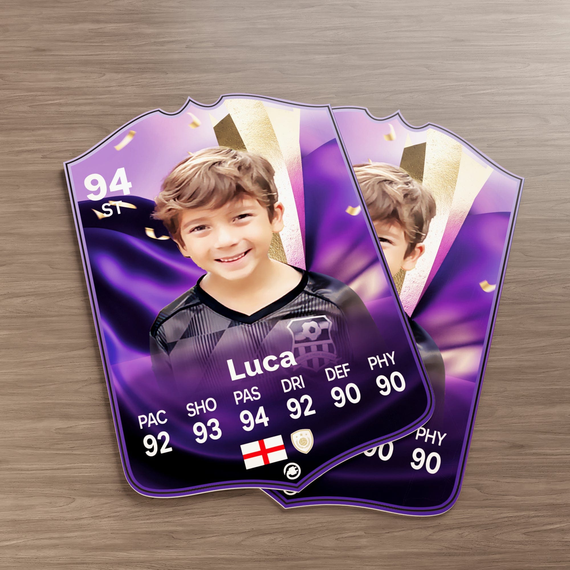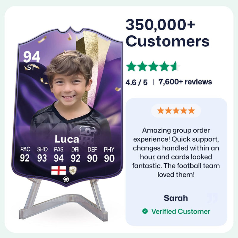 Yes! Our football card designers will remove the background from the photo you upload so it looks just like the football cards you might’ve seen games like EA FC 25, EA FC 24 or FIFA. We’ll also position the photo perfectly on the football card so it looks great. If there are any problems with the quality of your photo, we’ll reach out and let you know. Plus, our website's AI will remove the background on the image for visual purposes before purchase so you can see it without a background on the card.