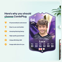 CardsPlug is home to the world’s favourite personalised football cards. Our easy football card builder lets you make a real life football card with your own name, photo, and skill ratings. With 100+ designs to choose from and some inspired by EA SPORTS FC 26 cards seen in EA FC 26, EA FC 25 and FC 24 as well as FIFA cards seen in games like FIFA 23 and FIFA 22.