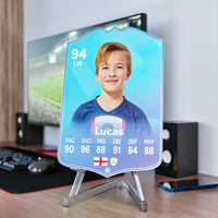 When it comes to personalising your card, the basic steps are to upload a photo and add a name to your card. Then you’ll add details like your player’s position and skill ratings out of 99 for each football skill shown on the card. Our online card builder makes this really easy. And if you aren’t a football card expert, don’t worry!