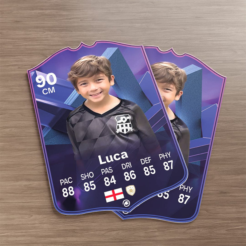 When it comes to personalising your card, the basic steps are to upload a photo and add a name to your card. Then you’ll add details like your player’s position and skill ratings out of 99 for each football skill shown on the card. Our online card builder makes this really easy. And if you aren’t a football card expert, don’t worry!