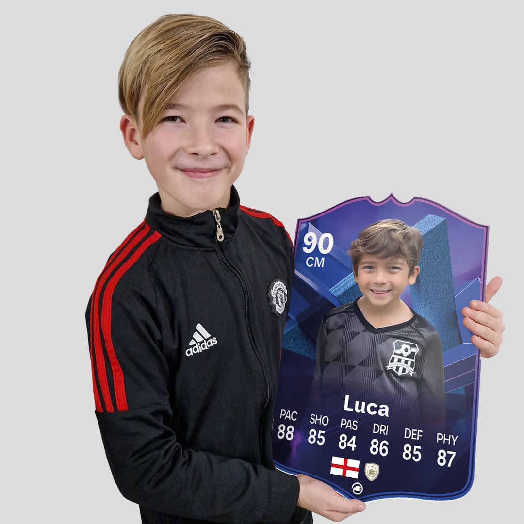 Our football card builder lets you choose between two different card materials. Our Standard cards are made of a ultra-strong variety of Foamex (not cardboard or foam!). This material has a lovely gloss finish and is also super durable. Our world-exclusive Metal football cards have a matte finish and are slightly heavier. Both look amazing and will last forever.