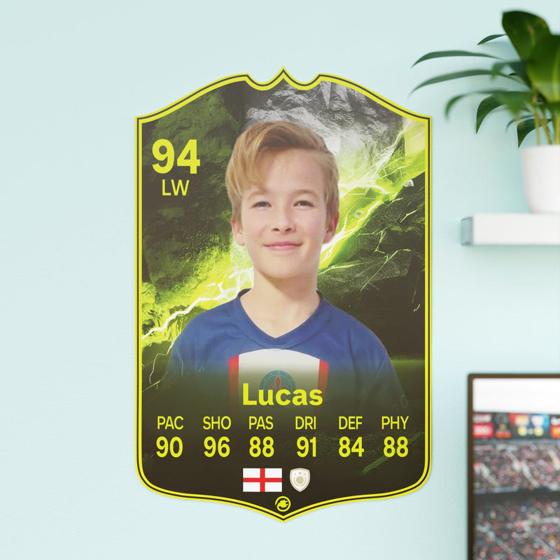 When it comes to personalising your card, the basic steps are to upload a photo and add a name to your card. Then you’ll add details like your player’s position and skill ratings out of 99 for each football skill shown on the card. Our online card builder makes this really easy. And if you aren’t a football card expert, don’t worry!