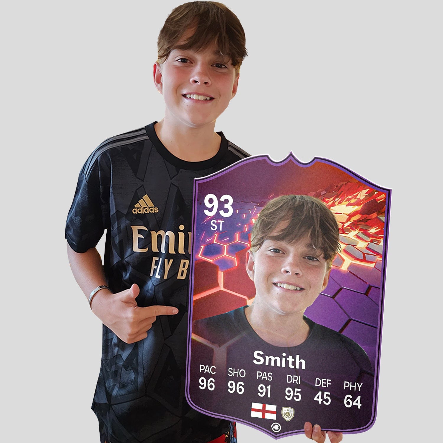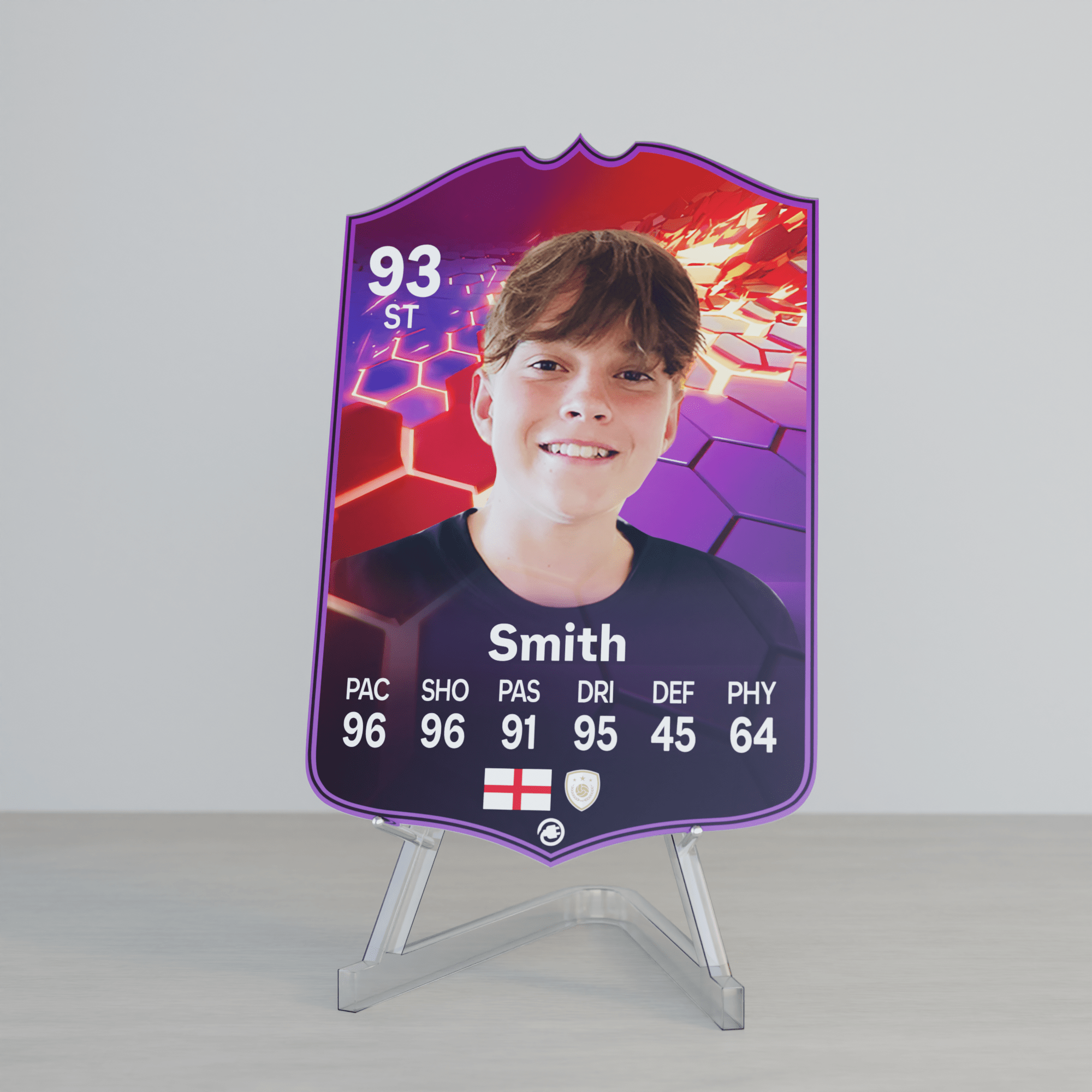 When it comes to personalising your card, the basic steps are to upload a photo and add a name to your card. Then you’ll add details like your player’s position and skill ratings out of 99 for each football skill shown on the card. Our online card builder makes this really easy. And if you aren’t a football card expert, don’t worry!