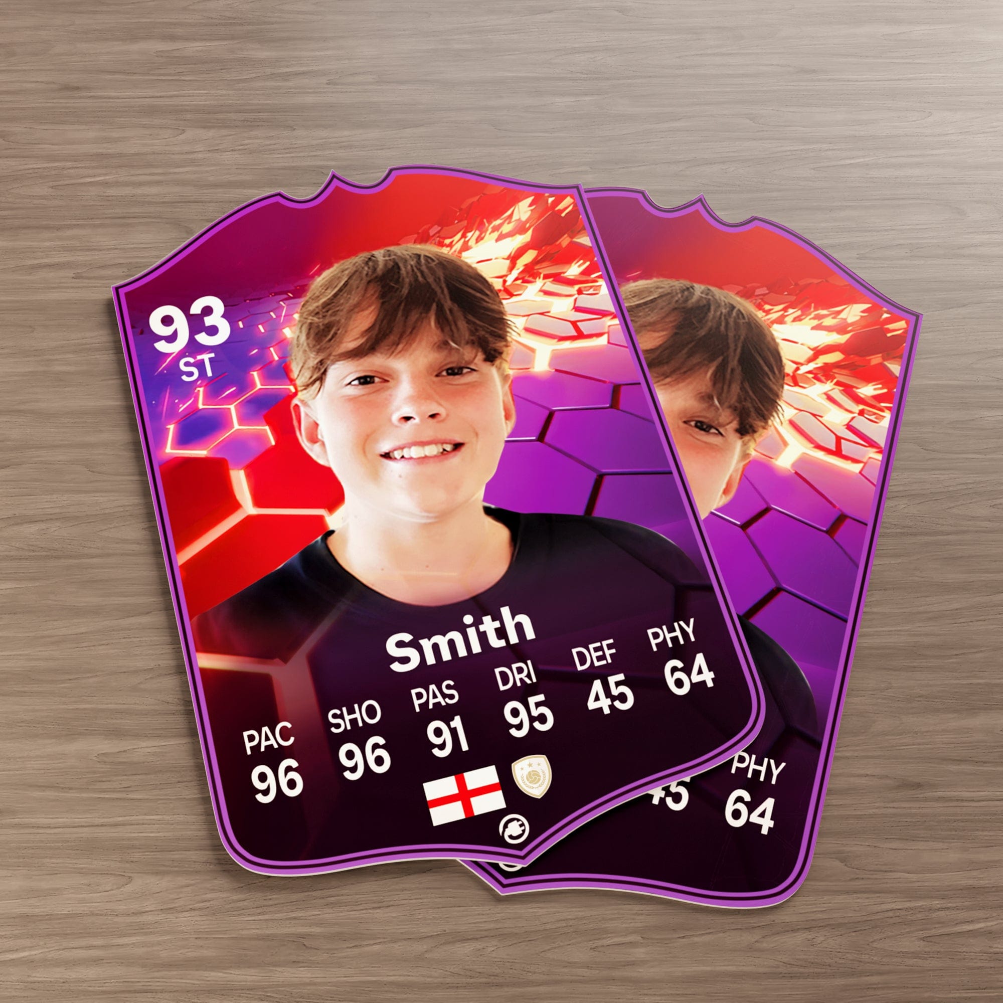 Our football card builder lets you choose between two different card materials. Our Standard cards are made of a ultra-strong variety of Foamex (not cardboard or foam!). This material has a lovely gloss finish and is also super durable. Our world-exclusive Metal football cards have a matte finish and are slightly heavier. Both look amazing and will last forever.