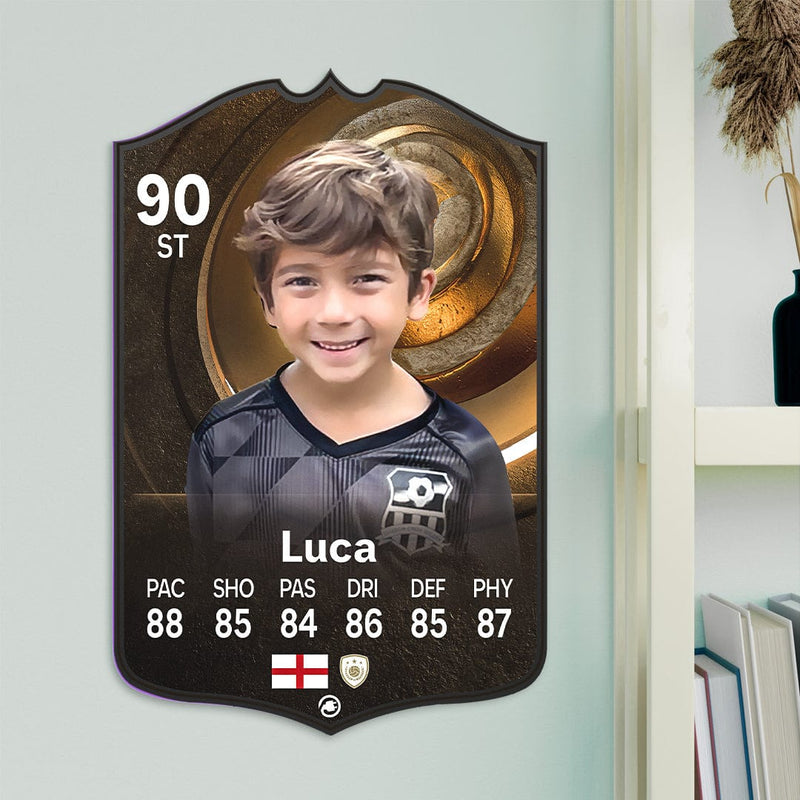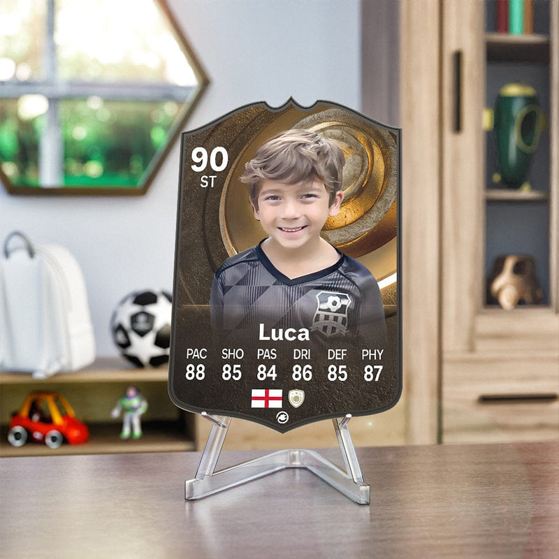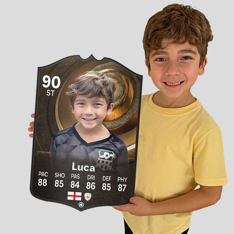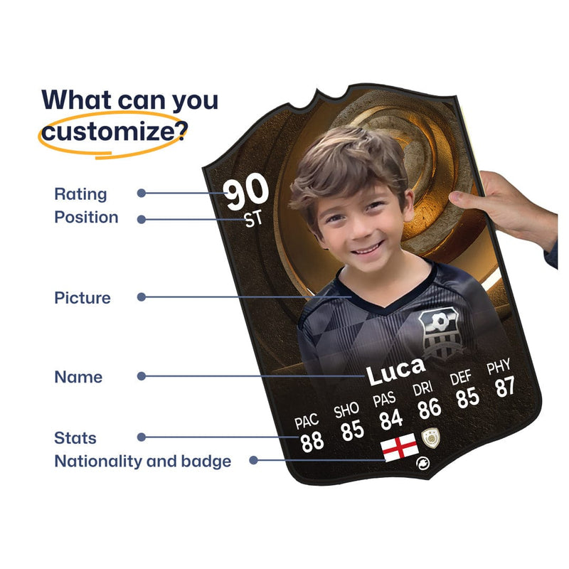 When it comes to personalising your card, the basic steps are to upload a photo and add a name to your card. Then you’ll add details like your player’s position and skill ratings out of 99 for each football skill shown on the card. Our online card builder makes this really easy. And if you aren’t a football card expert, don’t worry!
