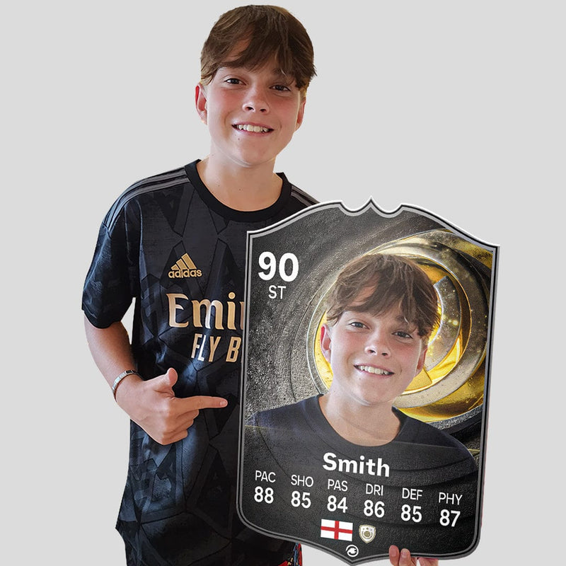 When it comes to personalising your card, the basic steps are to upload a photo and add a name to your card. Then you’ll add details like your player’s position and skill ratings out of 99 for each football skill shown on the card. Our online card builder makes this really easy. And if you aren’t a football card expert, don’t worry!