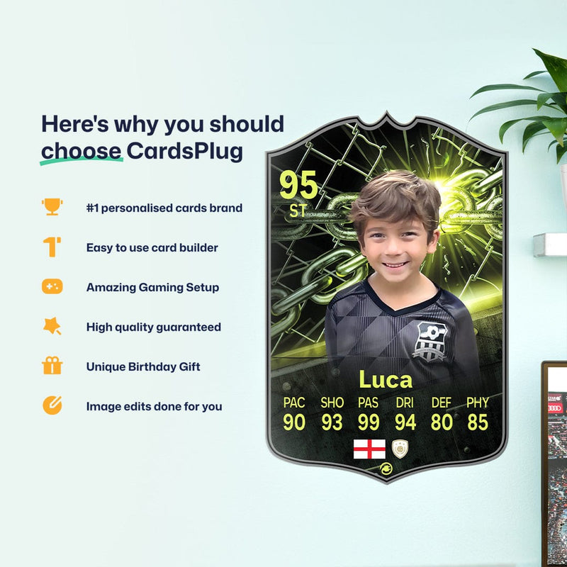 CardsPlug is home to the world’s favourite personalised football cards. Our easy football card builder lets you make a real life football card with your own name, photo, and skill ratings. With 100+ designs to choose from and some inspired by EA SPORTS FC 26 cards seen in EA FC 26, EA FC 25 and FC 24 as well as FIFA cards seen in games like FIFA 23 and FIFA 22.