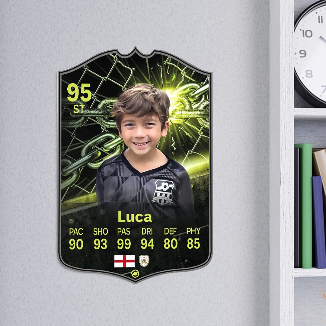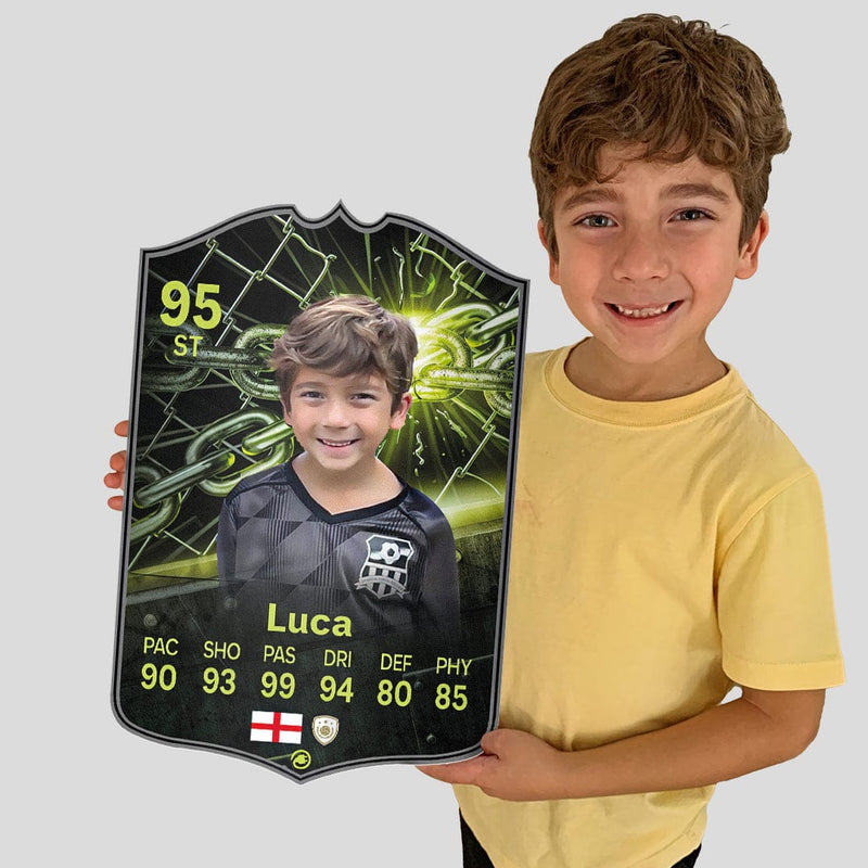 When it comes to personalising your card, the basic steps are to upload a photo and add a name to your card. Then you’ll add details like your player’s position and skill ratings out of 99 for each football skill shown on the card. Our online card builder makes this really easy. And if you aren’t a football card expert, don’t worry!