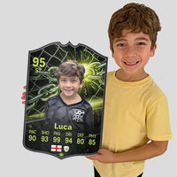 Our football card builder lets you choose between two different card materials. Our Standard cards are made of a ultra-strong variety of Foamex (not cardboard or foam!). This material has a lovely gloss finish and is also super durable. Our world-exclusive Metal football cards have a matte finish and are slightly heavier. Both look amazing and will last forever.