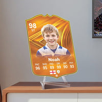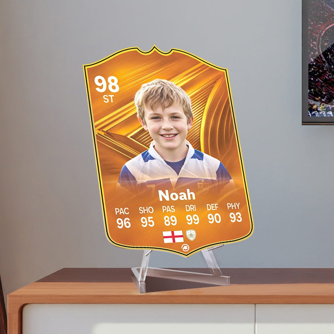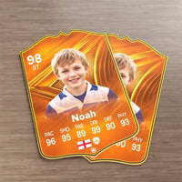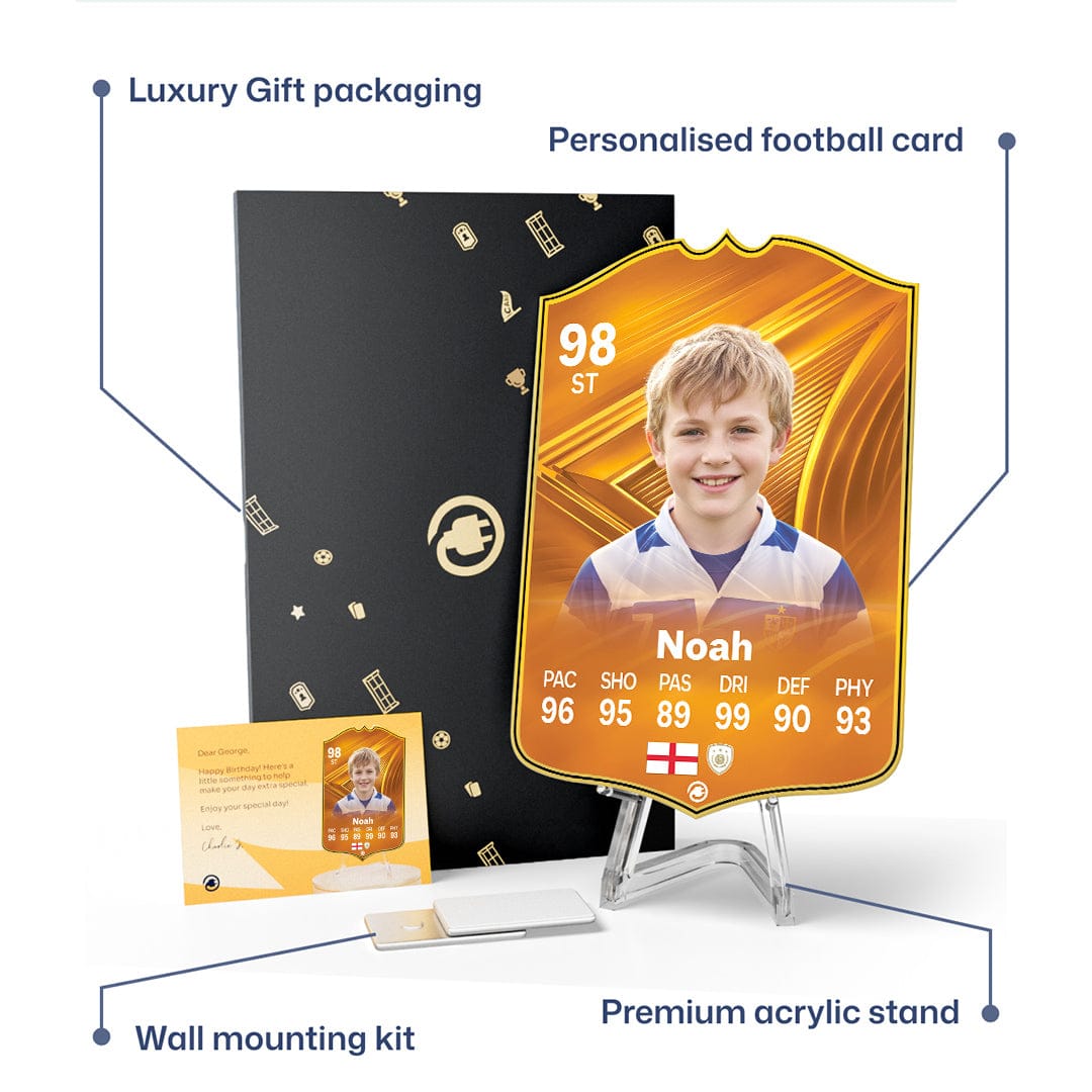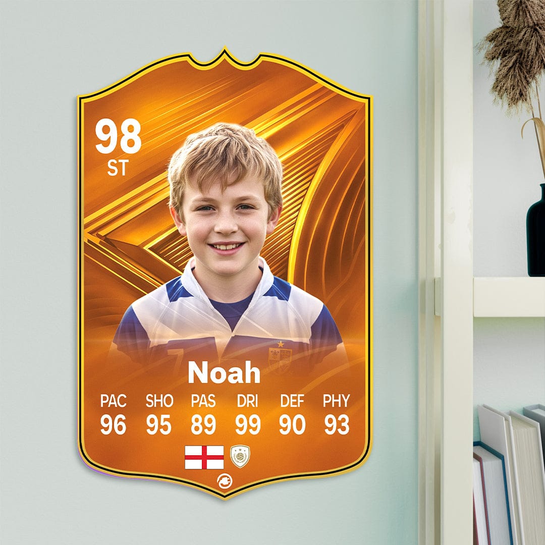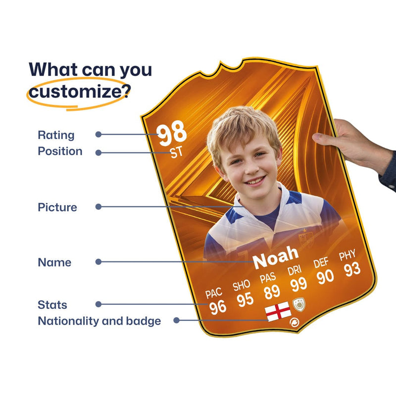 When it comes to personalising your card, the basic steps are to upload a photo and add a name to your card. Then you’ll add details like your player’s position and skill ratings out of 99 for each football skill shown on the card. Our online card builder makes this really easy. And if you aren’t a football card expert, don’t worry!