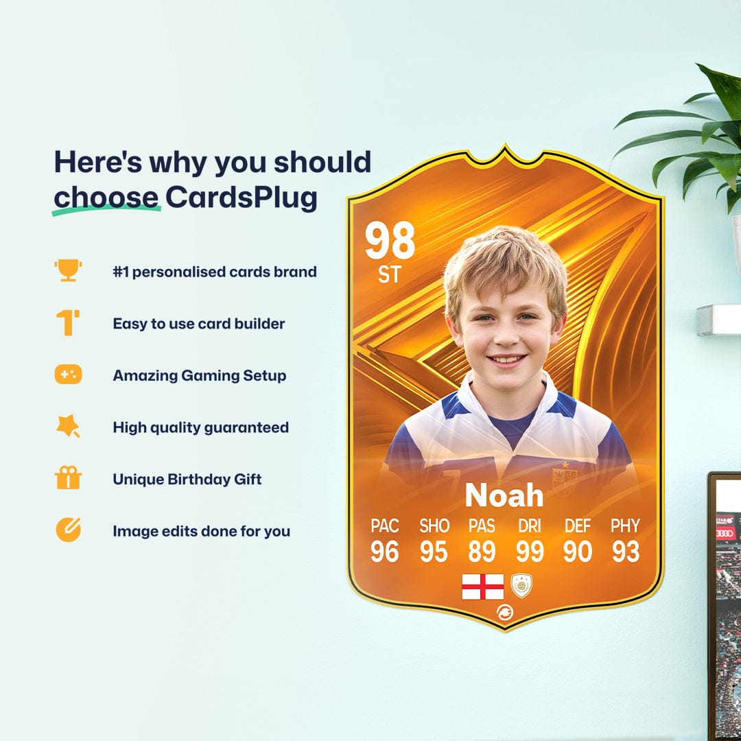 CardsPlug is home to the world’s favourite personalised football cards. Our easy football card builder lets you make a real life football card with your own name, photo, and skill ratings. With 100+ designs to choose from and some inspired by EA SPORTS FC 26 cards seen in EA FC 26, EA FC 25 and FC 24 as well as FIFA cards seen in games like FIFA 23 and FIFA 22.