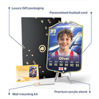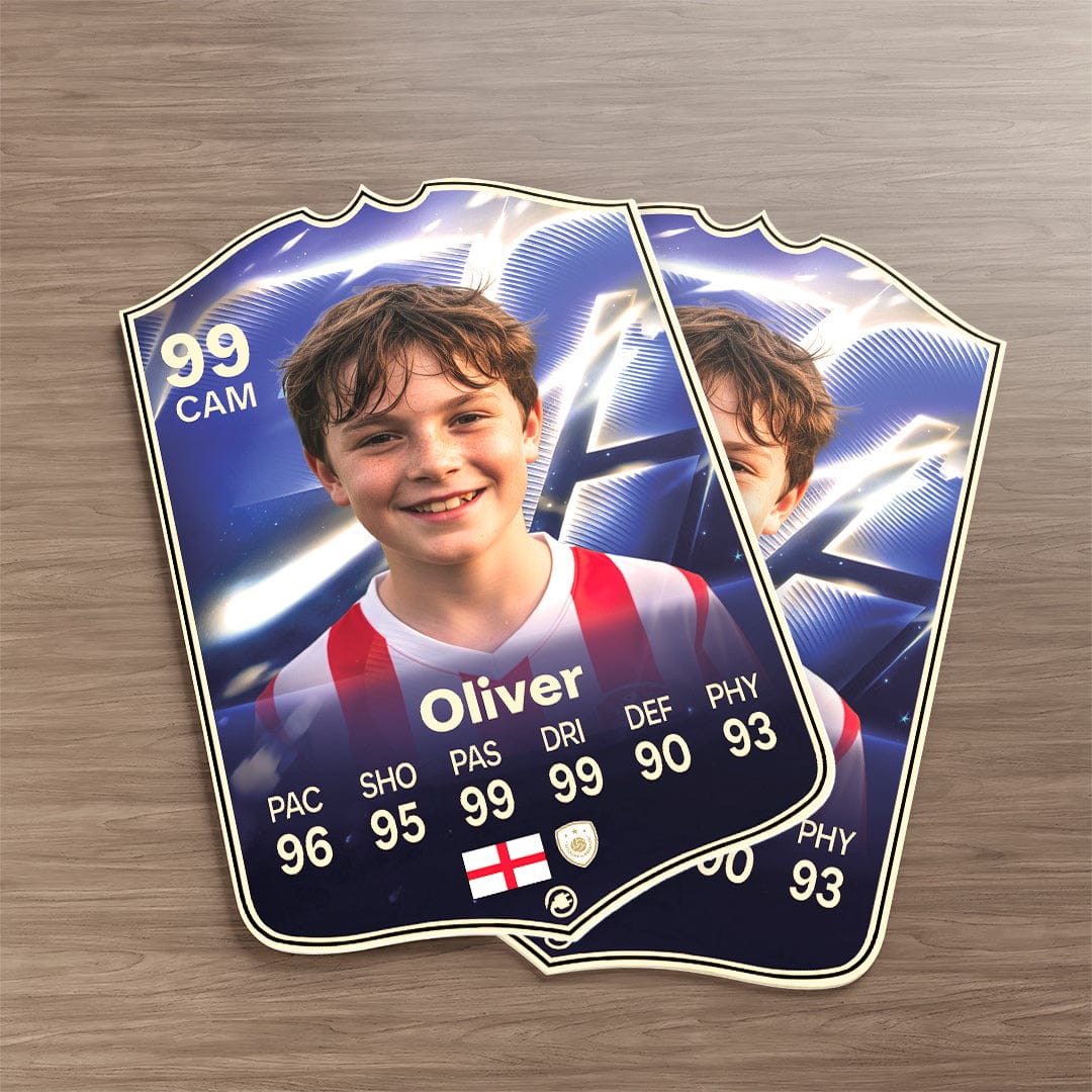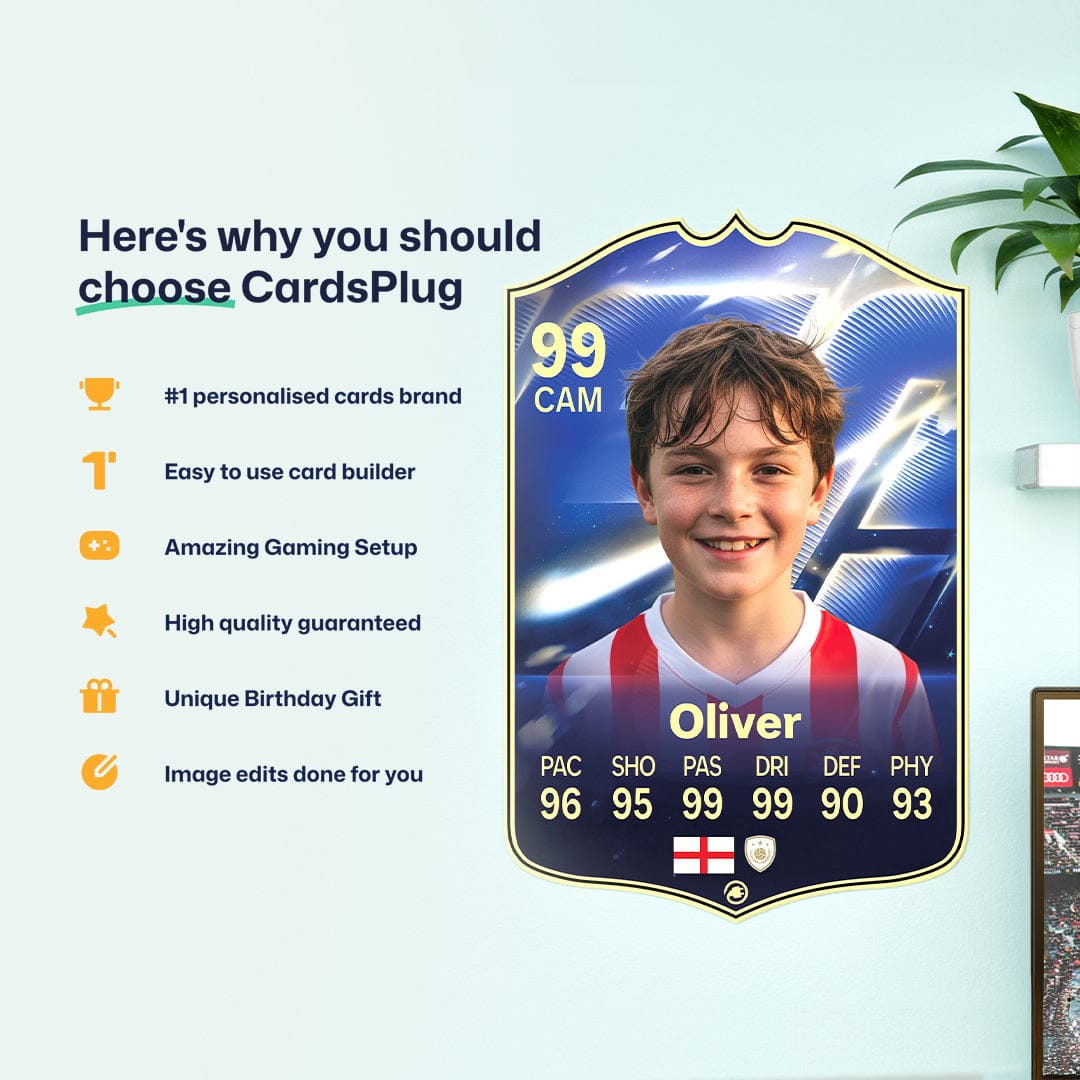CardsPlug is home to the world’s favourite personalised football cards. Our easy football card builder lets you make a real life football card with your own name, photo, and skill ratings. With 100+ designs to choose from and some inspired by EA SPORTS FC 26 cards seen in EA FC 26, EA FC 25 and FC 24 as well as FIFA cards seen in games like FIFA 23 and FIFA 22.