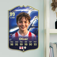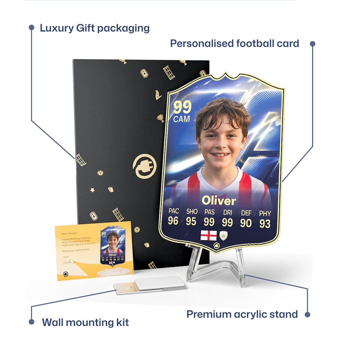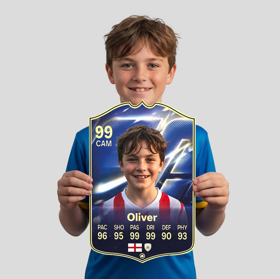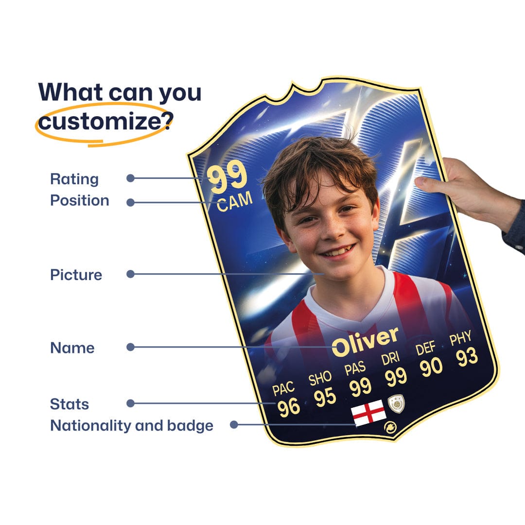 When it comes to personalising your card, the basic steps are to upload a photo and add a name to your card. Then you’ll add details like your player’s position and skill ratings out of 99 for each football skill shown on the card. Our online card builder makes this really easy. And if you aren’t a football card expert, don’t worry!