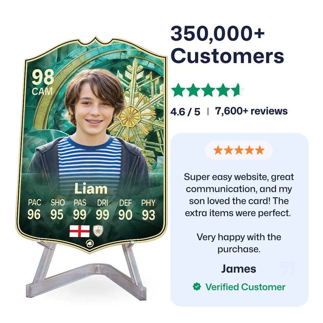 Once you’ve personalised your card, our design experts will edit your photo, design your card, and bring it to life in stunning quality. You’ll get a full preview before we print your card and every card’s quality is backed by our Gold Standard Guarantee. So far, over 350,000+ football fans agree: A CardsPlug football card is the ultimate football gift!