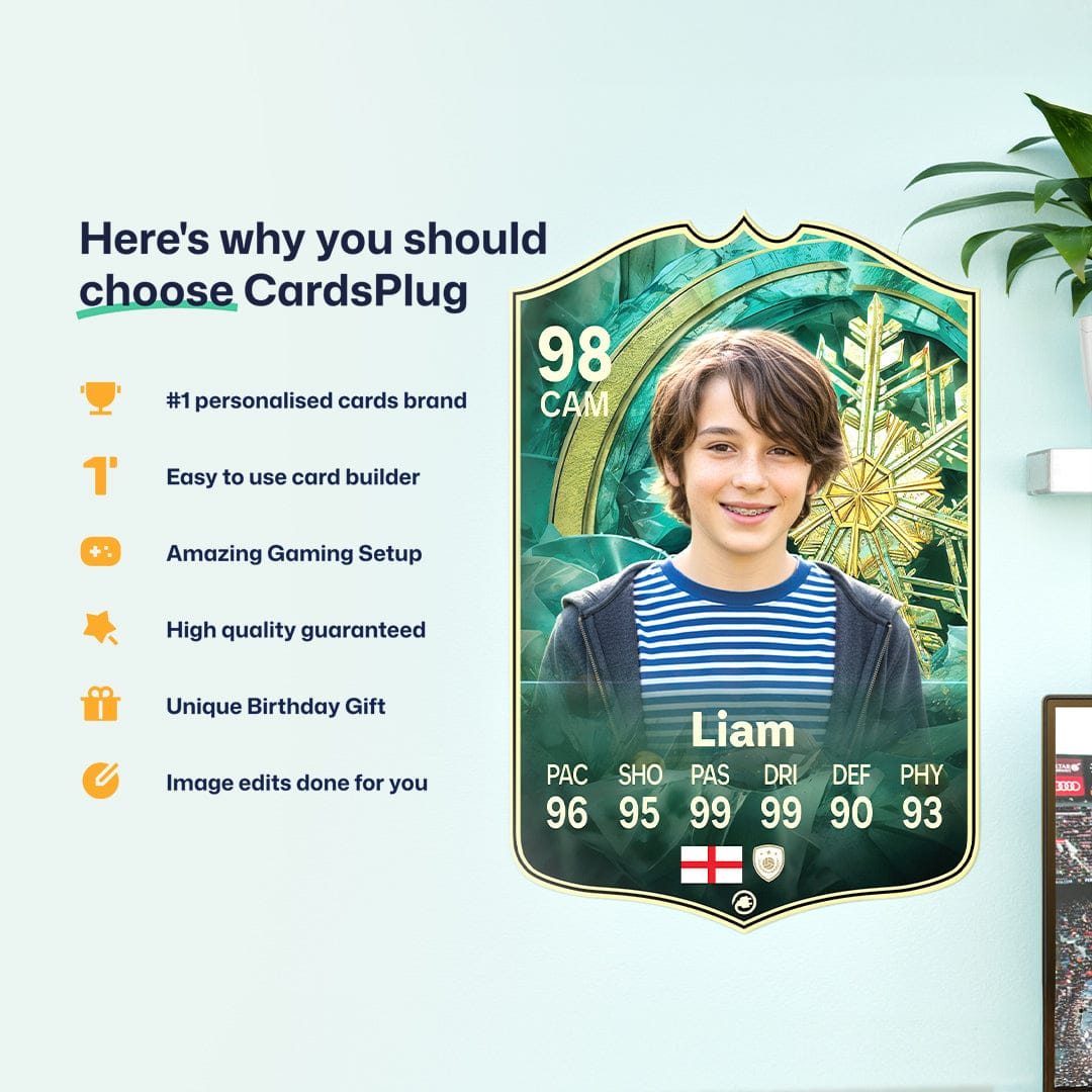 CardsPlug is home to the world’s favourite personalised football cards. Our easy football card builder lets you make a real life football card with your own name, photo, and skill ratings. With 100+ designs to choose from and some inspired by EA SPORTS FC 26 cards seen in EA FC 26, EA FC 25 and FC 24 as well as FIFA cards seen in games like FIFA 23 and FIFA 22.