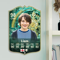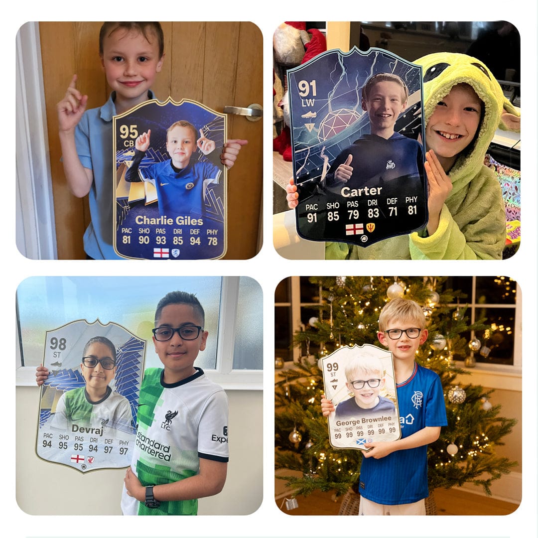 When it comes to personalising your card, the basic steps are to upload a photo and add a name to your card. Then you’ll add details like your player’s position and skill ratings out of 99 for each football skill shown on the card. Our online card builder makes this really easy. And if you aren’t a football card expert, don’t worry!