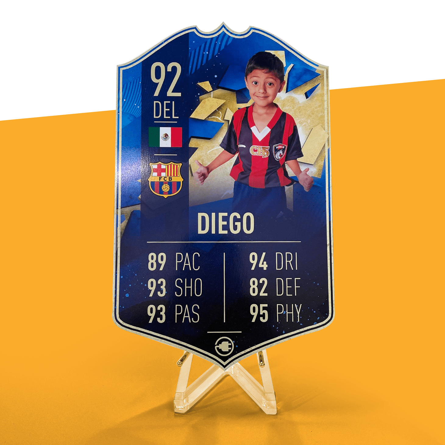 When it comes to personalising your card, the basic steps are to upload a photo and add a name to your card. Then you’ll add details like your player’s position and skill ratings out of 99 for each football skill shown on the card. Our online card builder makes this really easy. And if you aren’t a football card expert, don’t worry!