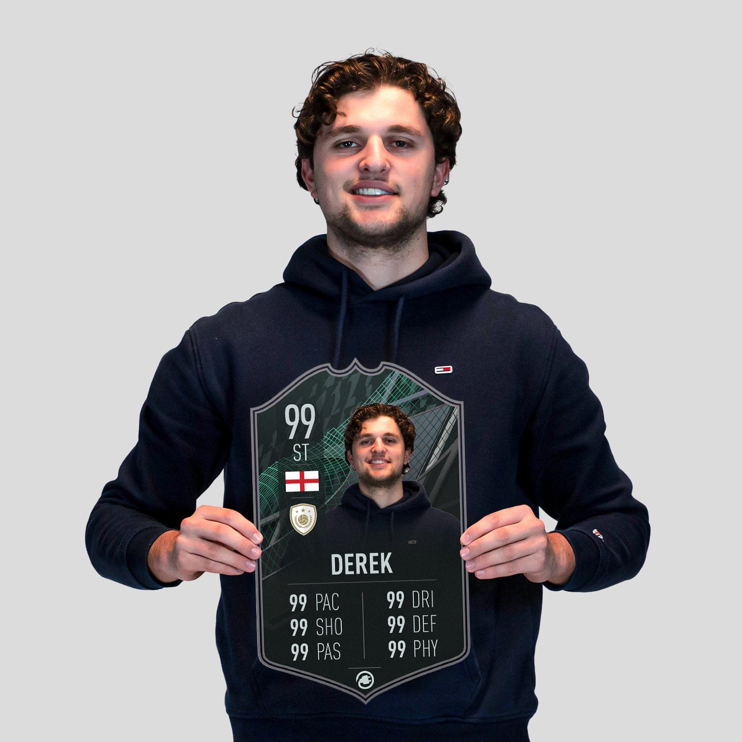 When it comes to personalising your card, the basic steps are to upload a photo and add a name to your card. Then you’ll add details like your player’s position and skill ratings out of 99 for each football skill shown on the card. Our online card builder makes this really easy. And if you aren’t a football card expert, don’t worry!