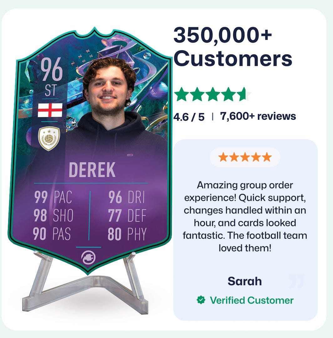 Once you’ve personalised your card, our design experts will edit your photo, design your card, and bring it to life in stunning quality. You’ll get a full preview before we print your card and every card’s quality is backed by our Gold Standard Guarantee. So far, over 350,000+ football fans agree: A CardsPlug football card is the ultimate football gift!