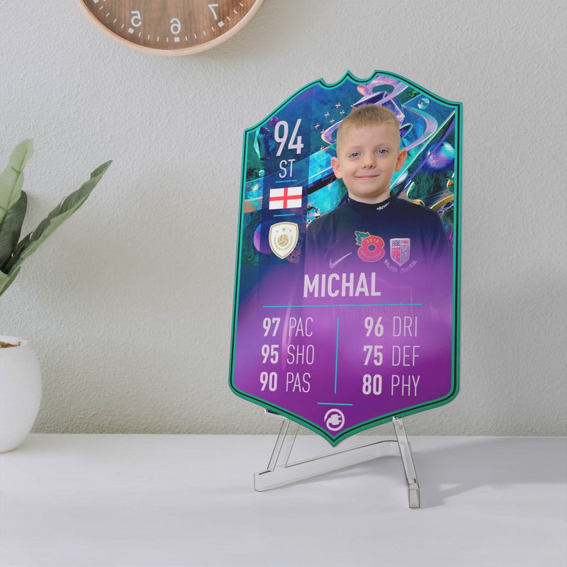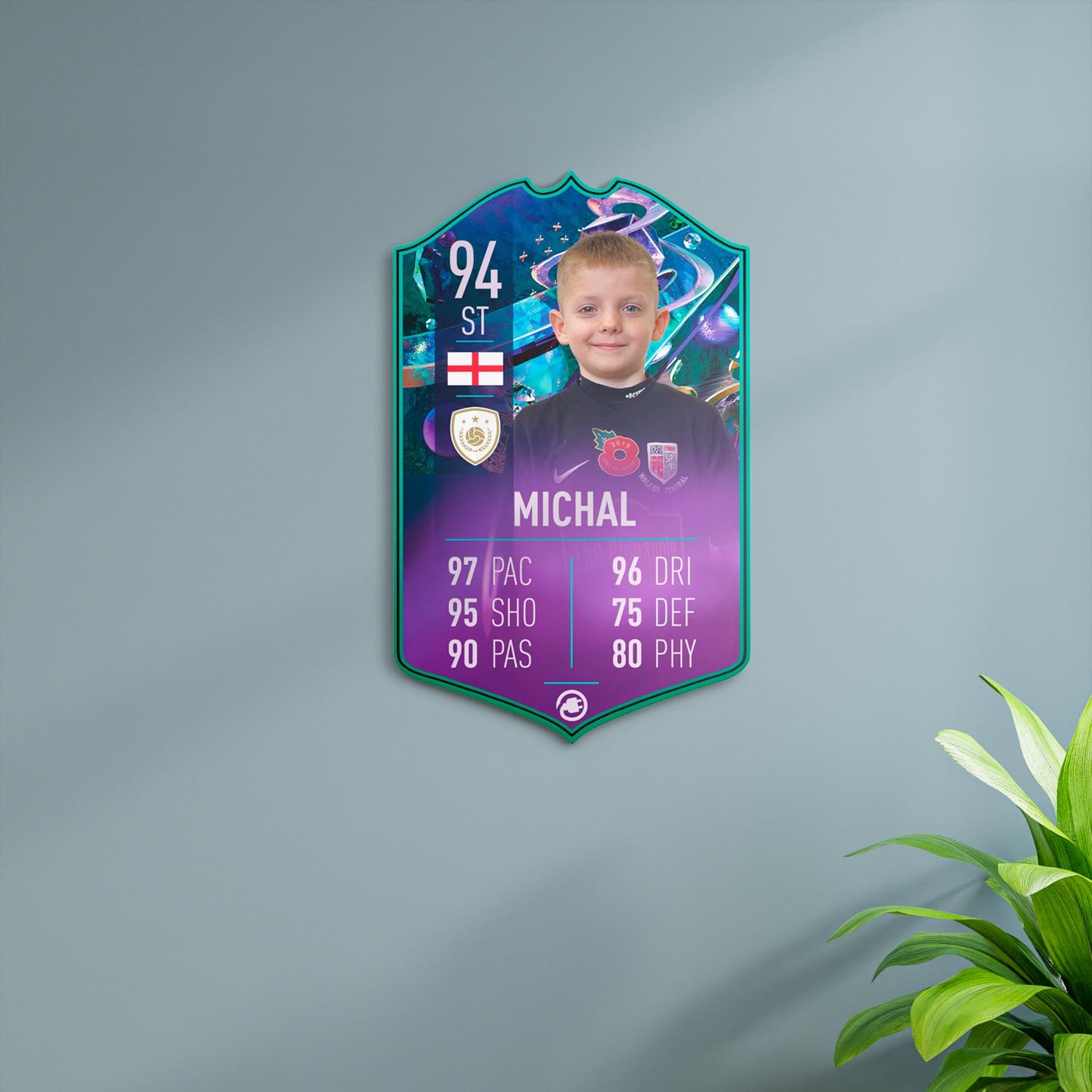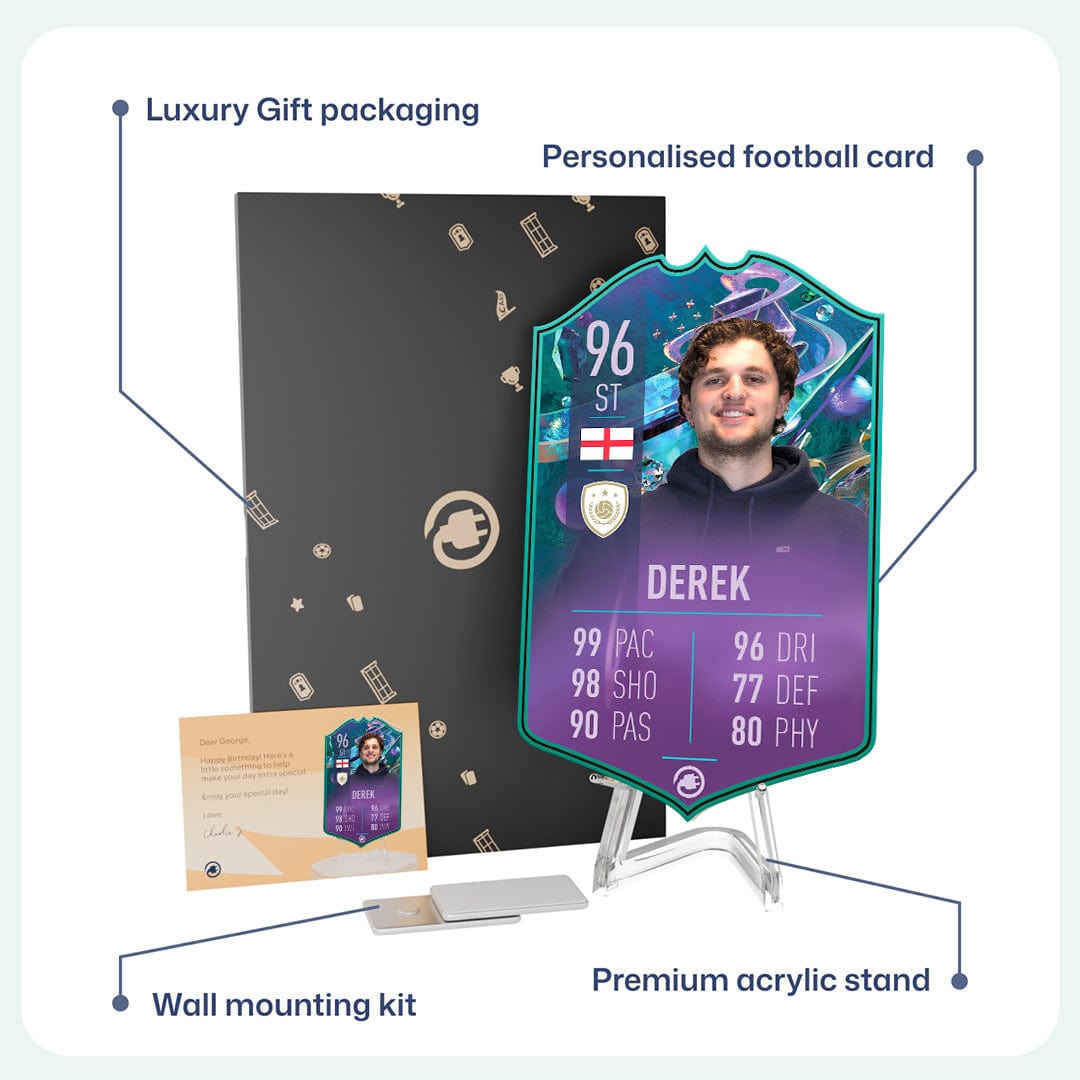When it comes to personalising your card, the basic steps are to upload a photo and add a name to your card. Then you’ll add details like your player’s position and skill ratings out of 99 for each football skill shown on the card. Our online card builder makes this really easy. And if you aren’t a football card expert, don’t worry!