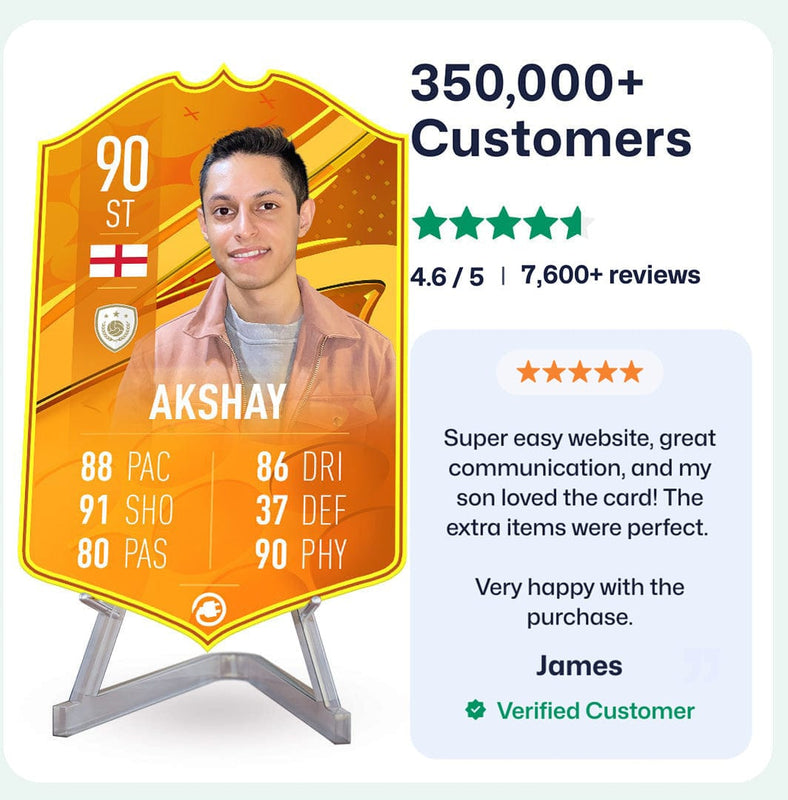 Yes! Our football card designers will remove the background from the photo you upload so it looks just like the football cards you might’ve seen games like EA FC 25, EA FC 24 or FIFA. We’ll also position the photo perfectly on the football card so it looks great. If there are any problems with the quality of your photo, we’ll reach out and let you know. Plus, our website's AI will remove the background on the image for visual purposes before purchase so you can see it without a background on the card.