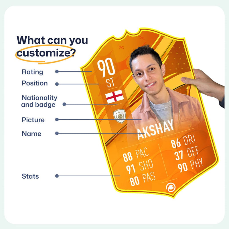 When it comes to personalising your card, the basic steps are to upload a photo and add a name to your card. Then you’ll add details like your player’s position and skill ratings out of 99 for each football skill shown on the card. Our online card builder makes this really easy. And if you aren’t a football card expert, don’t worry!