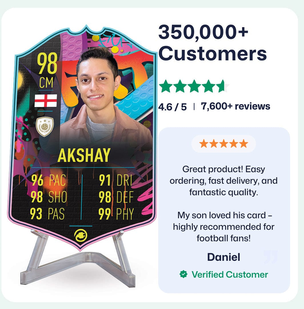Yes! Our football card designers will remove the background from the photo you upload so it looks just like the football cards you might’ve seen games like EA FC 25, EA FC 24 or FIFA. We’ll also position the photo perfectly on the football card so it looks great. If there are any problems with the quality of your photo, we’ll reach out and let you know. Plus, our website's AI will remove the background on the image for visual purposes before purchase so you can see it without a background on the card.