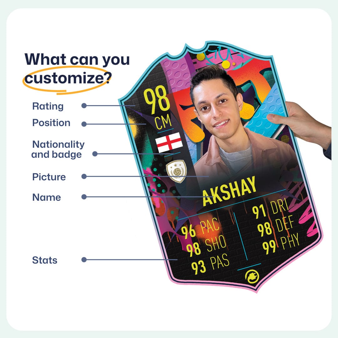 When it comes to personalising your card, the basic steps are to upload a photo and add a name to your card. Then you’ll add details like your player’s position and skill ratings out of 99 for each football skill shown on the card. Our online card builder makes this really easy. And if you aren’t a football card expert, don’t worry!
